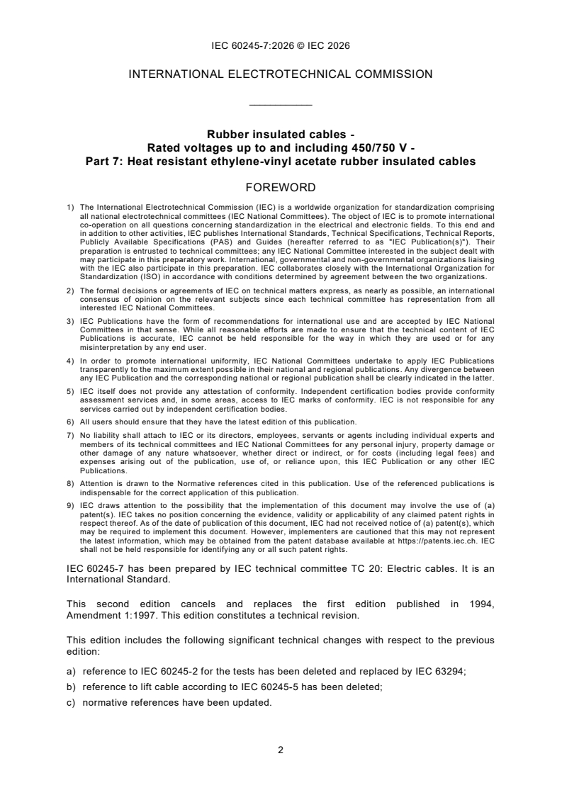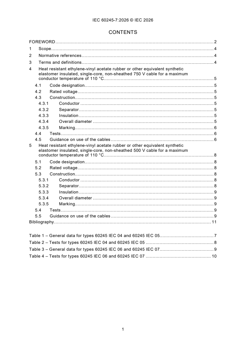IEC 60245-7:2026 defines the particular requirements for heat resistant ethylene-vinyl acetate rubber insulated cables of rated voltages up to and including 450/750 V, which apply in addition to the general requirements specified in IEC 60245-1, which apply to all cables.