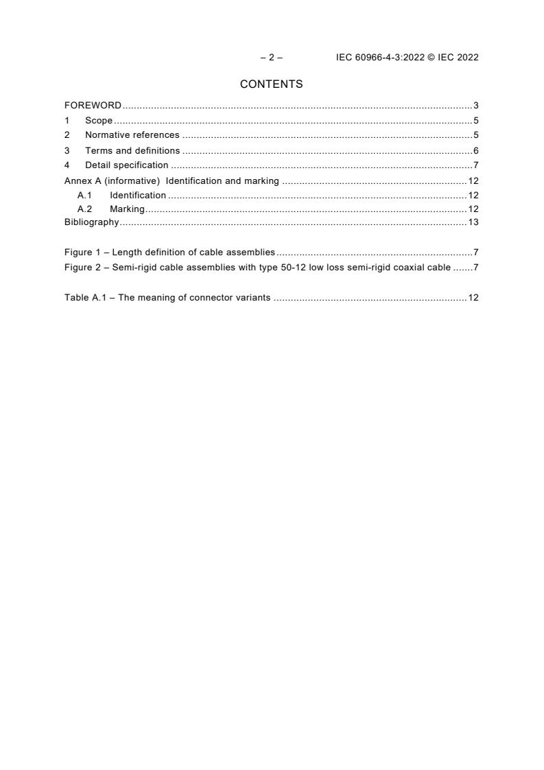IEC 60966-4-3:2022 is a standard published by the International Electrotechnical Commission (IEC). Its full title is "Radio frequency and coaxial cable assemblies - Part 4-3: Detail specification for semi-rigid cable assemblies - Frequency range up to 6 000 MHz, type 50-12 low loss semi-rigid coaxial cable". This standard covers: IEC 60966-4-3:2022 is a detail specification that relates to semi-rigid cable assemblies composed of type 50-12 low loss semi-rigid coaxial cables and connectors such as type 7-16 (IEC 61169-4), type 4.1-9.5 (IEC 61169-11), type N (IEC 61169-16), type S7-16 (IEC 61169-53) or type 4.3-10 (IEC 61169-54). This detail specification applies to the cable assemblies (jumper cables) for mobile communication, particularly for the cable assemblies used between the main feeder and antennas or between the main feeder and equipment system or between remote radio heads and antennas. The operating frequency is up to 6 000 MHz.