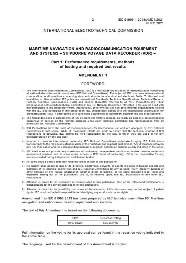 IEC 61996-1:2013/AMD1:2021 - Amendment 1 - Maritime navigation and radiocommunication equipment and systems - Shipborne voyage data recorder (VDR) - Part 1: Performance requirements, methods of testing and required test results