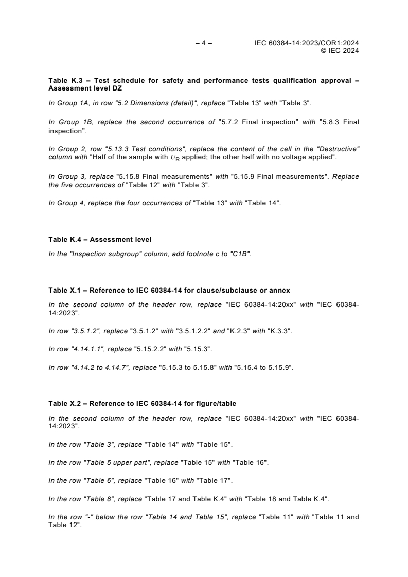 IEC 60384-14:2023/COR1:2024 is a standard published by the International Electrotechnical Commission (IEC). Its full title is "Corrigendum 1 - Fixed capacitors for use in electronic equipment - Part 14: Sectional specification - Fixed capacitors for electromagnetic interference suppression and connection to the supply mains". This standard covers: IEC 60384-14:2023 applies to capacitors and resistor-capacitor combinations intended to be connected to AC mains or other supply with a nominal voltage not exceeding 1 000 V AC (RMS), and with a nominal frequency not exceeding 100 Hz. This document includes also additional specific conditions and requirements for the connection to DC supplies with a rated voltage not exceeding 1 500 V DC. The principal object of this part of IEC 60384 is to prescribe preferred ratings and characteristics and to select, from IEC 60384-1, the appropriate quality assessment procedures, tests and measuring methods and to give general performance requirements for this type of capacitor. Test severities and requirements prescribed in detail specifications referring to this sectional specification are of equal or higher performance level; lower performance levels are not permitted. This document also provides a schedule of safety tests to be used by national testing stations in countries where approval by such stations is required. The overvoltage categories in combination with the AC mains voltages for the capacitors classified in this document are to be taken from IEC 60664-1. This edition includes the following significant technical changes with respect to the previous edition: in damp heat steady state test, all capacitor types are tested both with and without rated voltage; the number of test pieces has been increased; tangent of loss angle is added In Group 0 tests, in safety tests only; qualification approval based on safety and performance tests has been removed from the main text to a normative annex; the range of rated voltages is given instead of exact rated voltage values; normative annex for description of capacitor styles and of creepage/clearance distance measurement has been added; the importance of mechanical failures (cracks) in component encapsulation as a safety feature is highlighted in handling instructions and requirements after all relevant tests.