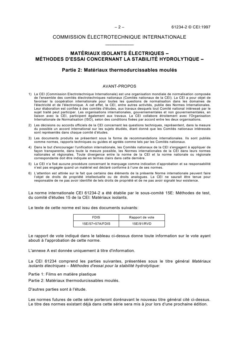 IEC 61234-2:1997, titled "Electrical insulating materials - Methods of test for the hydrolytic stability - Part 2: Moulded thermosets," is an international standard developed by the International Electrotechnical Commission (IEC). This standard specifies the test method used to determine the hydrolytic stability of moulded thermoset materials made from room temperature or oven-curing reaction resins. The method evaluates how these materials withstand the simultaneous exposure to water and elevated temperatures without applying mechanical stress to the test specimens. It measures the irreversible changes in mechanical and electrical properties, which are critical for the reliability and longevity of electrical insulation under harsh environmental conditions.