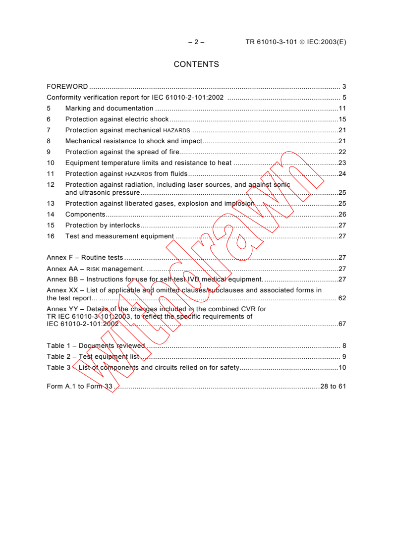 This report is a Technical Report and is of a purely informative nature and is therefore by itself not to be regarded as an International Standard. It is to assist users of the standard with determining and recording verification of conformity of the equipment under test with the requirements of: IEC 61010-2-101: 2002 The protocol for completion of this report is contained in publication IEC 61010-3:2003