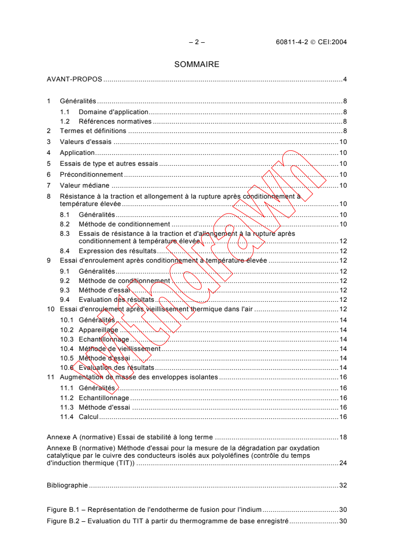 IEC 60811-4-2:2004 is a standard published by the International Electrotechnical Commission (IEC). Its full title is "Insulating and sheathing materials of electric and optical cables - Common test methods - Part 4-2: Methods specific to polyethylene and polypropylene compounds - Tensile strength and elongation at break after conditioning at elevated temperature - Wrapping test after conditioning at elevated temperature - Wrapping test after thermal ageing in air - Measurement of mass increase - Long-term stability test - Test method for copper-catalyzed oxidative degradation". This standard covers: Specifies the test methods for testing polymeric insulating and sheathing materials of electric and optical fibre cables for power distribution and communications, including cables used on ships and in offshore applications. These test methods apply specifically to polyolefin insulation and sheath. The principal changes with respect to the previous edition are listed below: a) A measurement of tensile strength is included in Clause 8. b) Clause 10 is now the only method in IEC 60811 for wrapping test after thermal ageing in air. c) Two ageing conditions are now specified for the long-term stability test in Annex A.