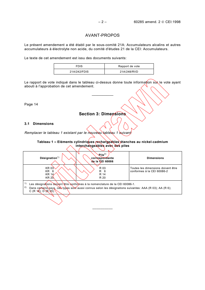 Amendement 2 - Accumulateurs alcalins - Eléments individuels cylindriques rechargeables étanches au nickel-cadmium