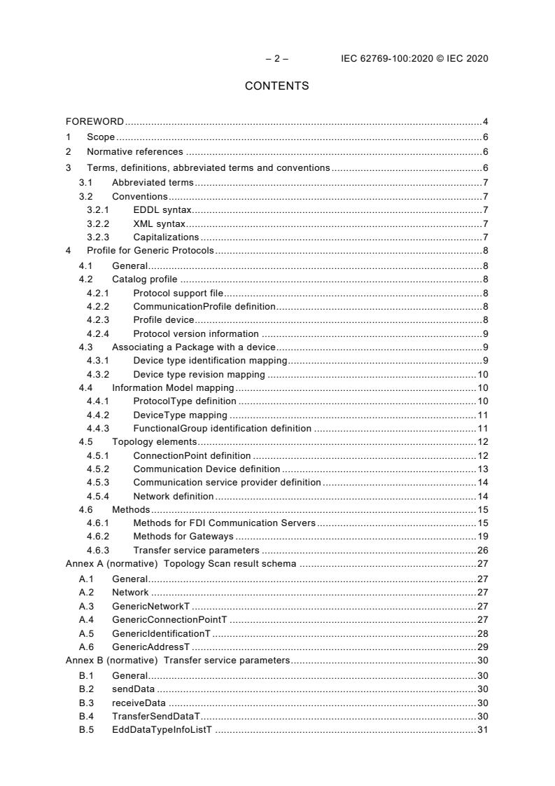 IEC 62769-100:2020 is a standard published by the International Electrotechnical Commission (IEC). Its full title is "Field device integration (FDI) - Part 100: Profiles - Generic protocols". This standard covers: IEC 62769-100:2020 specifies an FDI profile of IEC 62769 for generic protocols. That means that all interfaces are defined, and a host can add support for more protocols without changing its implementation. Nevertheless, there are some protocol-specific definitions (PSD) that need to be specified per protocol using this profile. Annex C specifies what PSDs need to be defined per protocol so that FDI Device Packages, FDI Communication Packages for Gateways and FDI Communication Servers, FDI Communication Servers, Gateways and Devices supporting such a protocol can work together in a host not aware about this specific protocol.