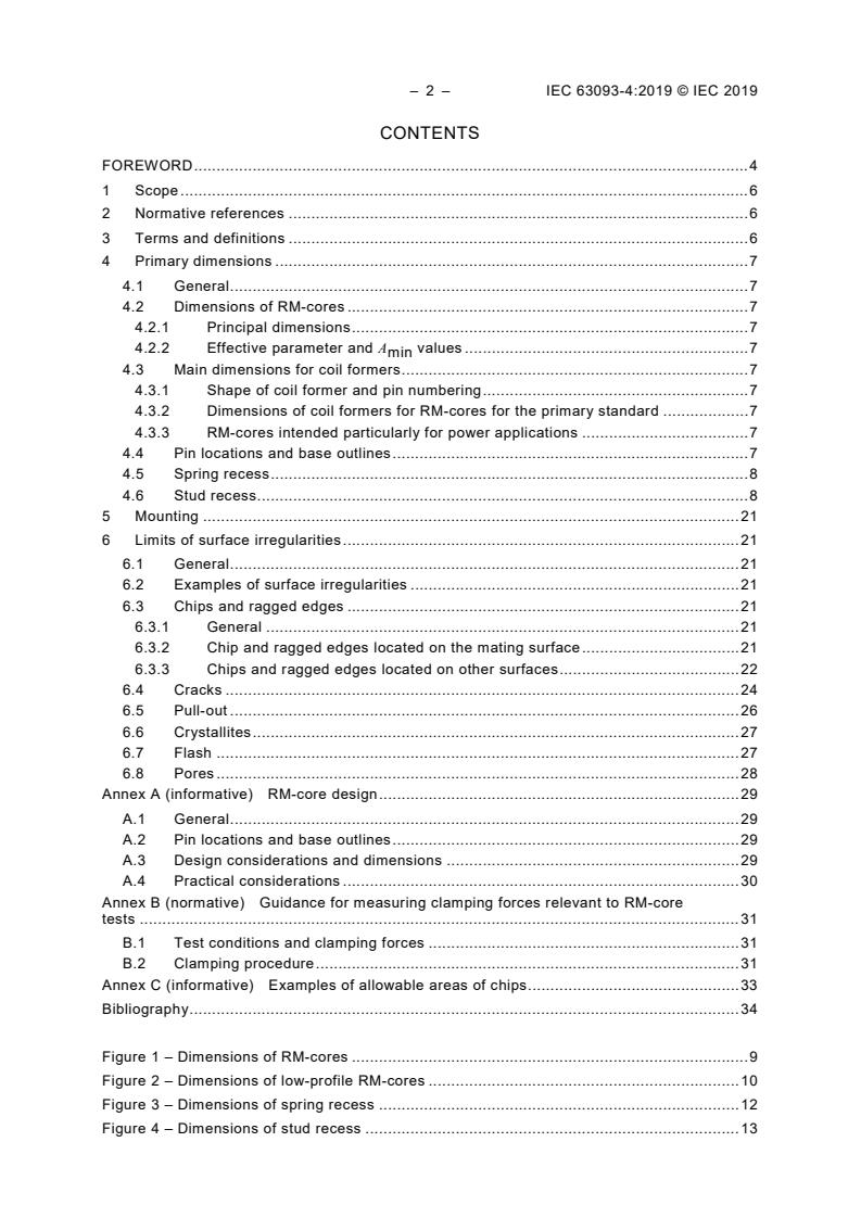 IEC 63093-4:2019 specifies the dimensions that are of importance for mechanical interchangeability for a preferred range of RM-cores and low-profile RM-cores made of ferrite, and the locations of their terminal pins on a 2,54 mm printed wiring grid in relation to the base outlines of the cores. It also gives guidance on allowable limits of surface irregularities applicable to RM-cores in accordance with the relevant generic specification.