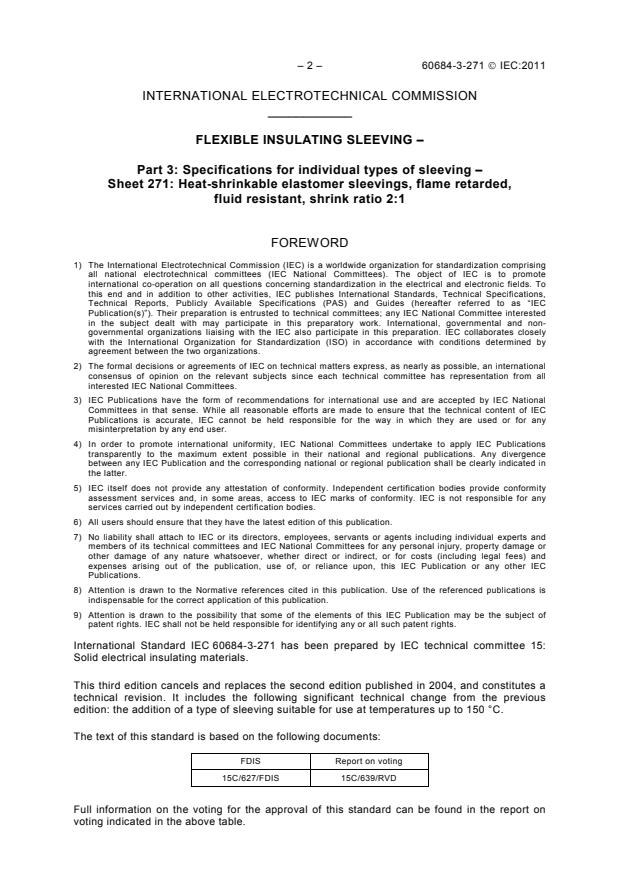 IEC 60684-3-271:2011 is a standard published by the International Electrotechnical Commission (IEC). Its full title is "Flexible insulating sleeving - Part 3: Specifications for individual types of sleeving - Sheet 271: Heat-shrinkable elastomer sleevings, flame retarded, fluid resistant, shrink ratio 2:1". This standard covers: IEC 60684-3-271:2011 gives the requirements for four types of heat-shrinkable, flame retarded, fluid resistant, elastomer sleevings, nominal shrink ratio of 2:1. - Type A: standard wall thickness for use at temperatures up to 120 °C - Type B: thin wall thickness for use at temperatures up to 120 °C - Type C: standard wall thickness for use at temperatures up to 150 °C - Type D: thin wall thickness for use at temperatures up to 150 °C. The significant technical change from the previous edition is the addition of a type of sleeving suitable for use at temperatures up to 150 °C. This edition includes the following significant technical change from the previous edition: the addition of a type of sleeving suitable for use at temperatures up to 150 °C.