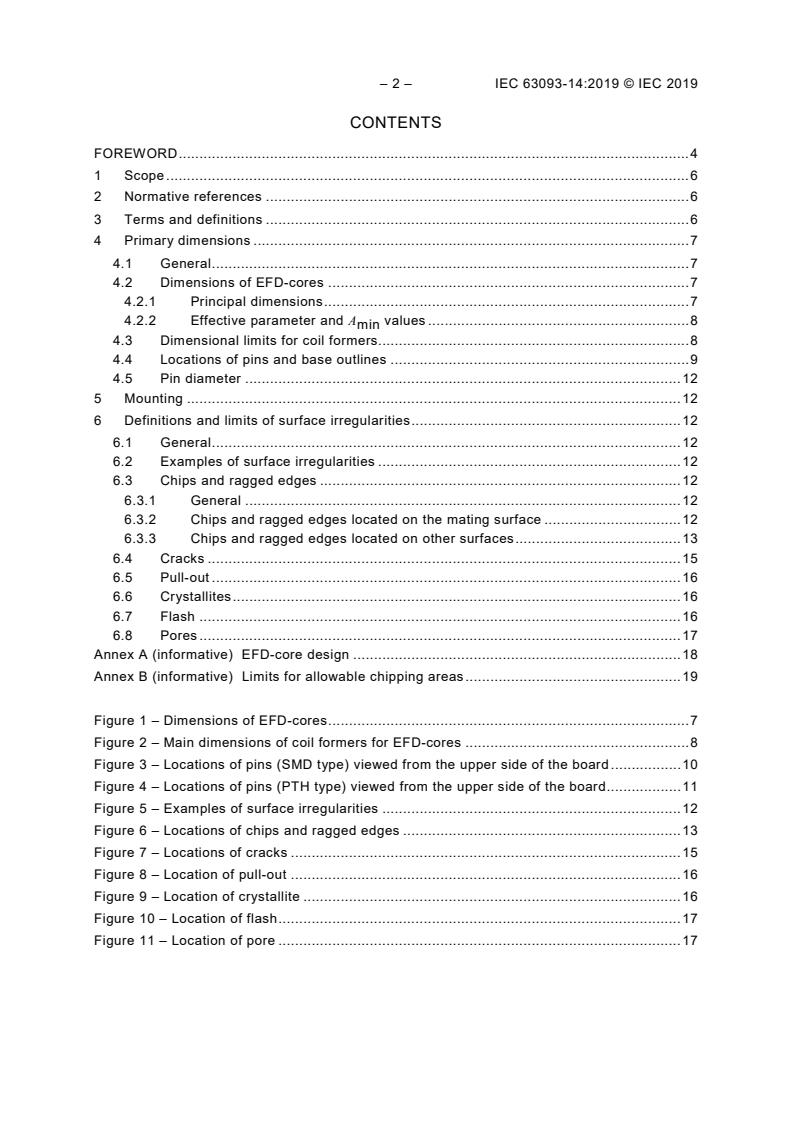 This 2019 edition replaces the earlier IEC 62317-14:2008 standard and brings updated technical requirements, notably introducing guidelines for surface irregularity limits. The document is intended to harmonize core size selections based on industry standards and widespread industrial use, making it valuable for both designers and manufacturers working with magnetic components involving ferrite EFD cores.