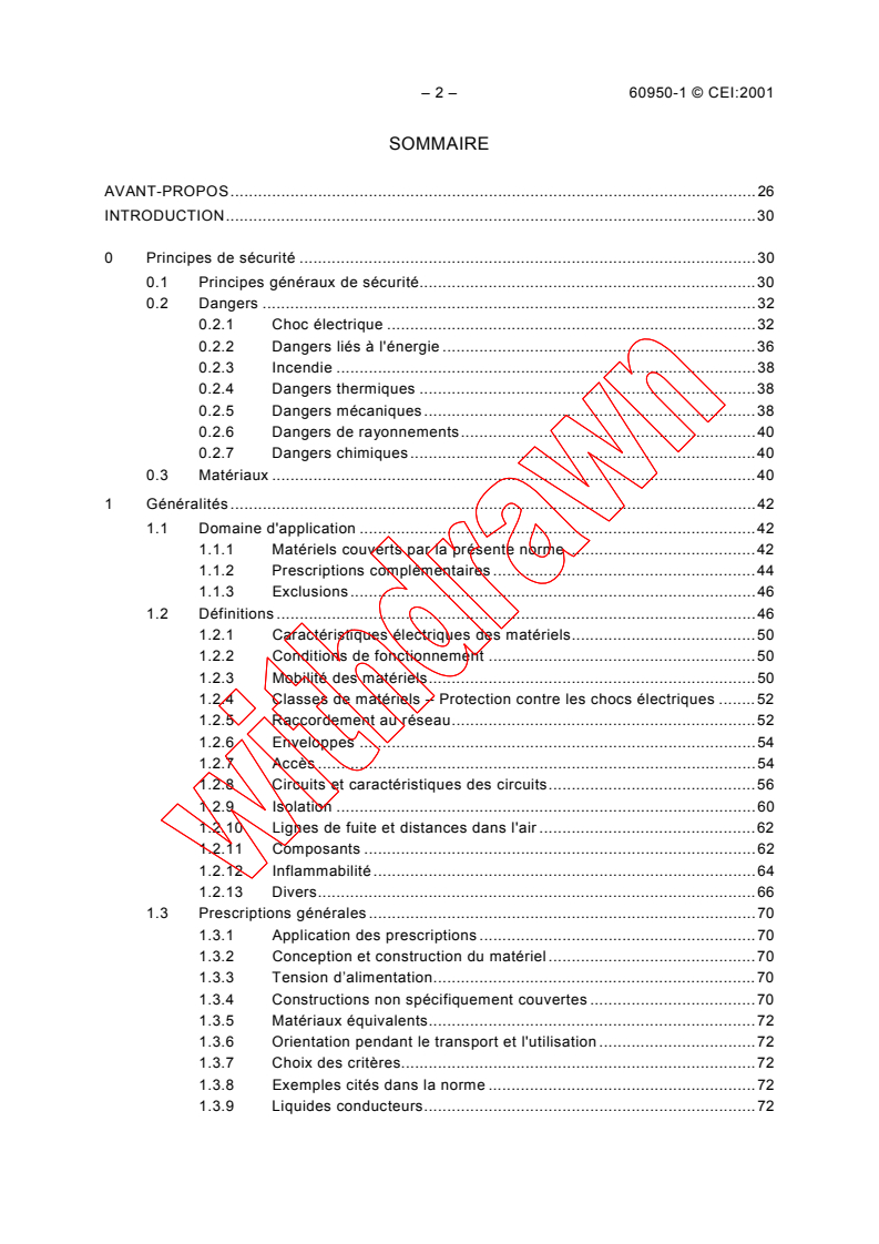La présente norme est aussi applicable à de tels matériels de traitement de l'information: - étudiés pour être utilisés comme équipements terminaux de télécommunications et matériels d'infrastructure de RESEAUX DE TELECOMMUNICATIONS, quelle que soit la source d'alimentation; - étudiés et prévus pour être connectés directement à un SYSTEME DE DISTRIBUTION PAR CABLES, ou pour y être utilisés comme matériels d'infrastructure quelle que soit la source d'alimentation; - destinés à utiliser le RESEAU D'ALIMENTATION EN COURANT ALTERNATIF comme moyen de transmission de télécommunications La présente norme spécifie les prescriptions prévues pour réduire les risques de feu, de chocs électriques ou de blessures pour l'OPERATEUR et le personnel non spécialisé qui peut entrer en contact avec le matériel et, lorsque c'est indiqué spécifiquement, pour le PERSONNEL DE MAINTENANCE Cette première édition de la CEI 60950-1 annule et remplace la troisième édition de la CEI 60950, parue en 1999, et constitue une révision technique.