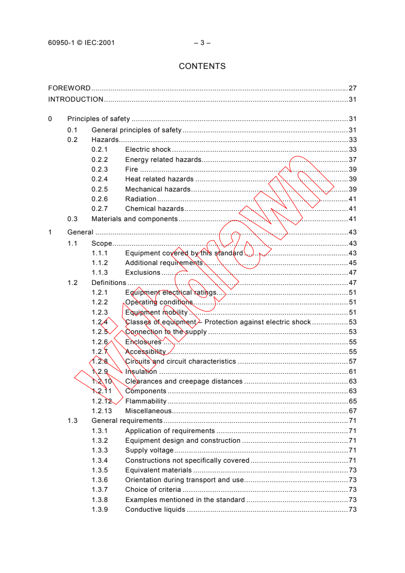 IEC 60950-1:2001 - "Information technology equipment - Safety - Part 1: General requirements" is an international safety standard for mains‑powered or battery‑powered information technology (IT) equipment with a rated voltage not exceeding 600 V. It applies also to telecommunication terminal and network infrastructure equipment, cable distribution systems and equipment that use the AC mains as a communication transmission medium. The standard’s objective is to reduce risks of fire, electric shock and injury for operators, laymen and, where specified, service personnel. This first edition (2001) cancels and replaces the third edition of IEC 60950 (1999) and constitutes a technical revision.