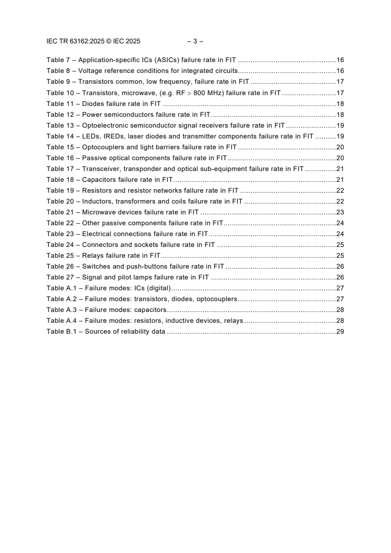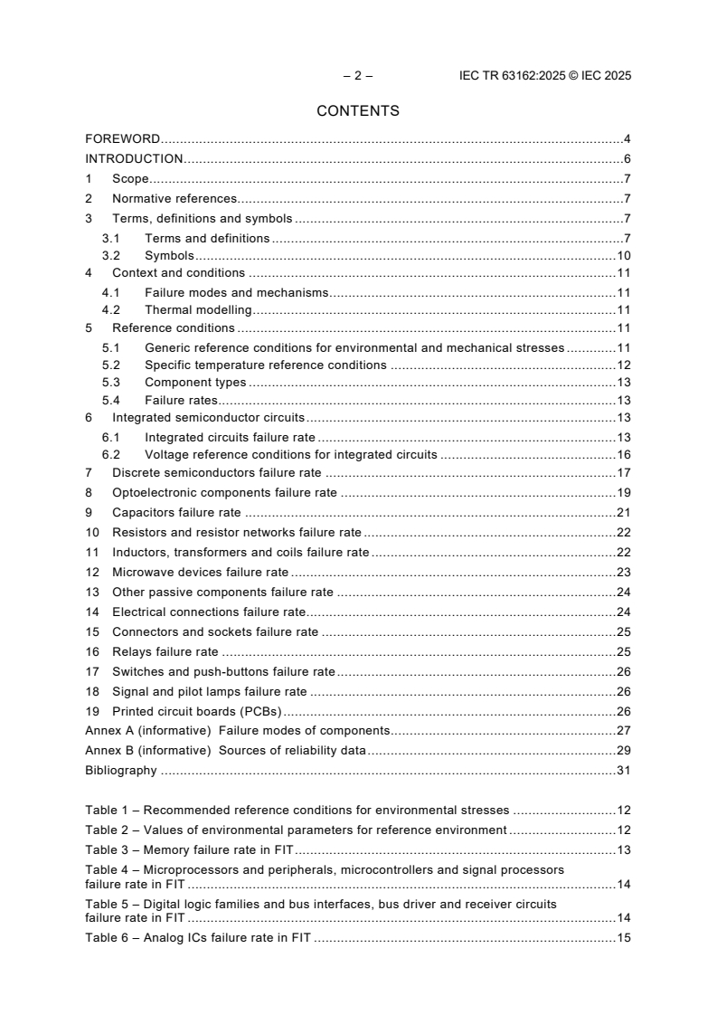 IEC TR 63162:2025, which is a Technical Specification, provides failure rates at reference conditions for electric components, considering reference conditions defined in IEC 61709. Reference conditions are useful since they provide a known standard basis from which failure rates can be modified to account for differences in environment from the environments taken as reference conditions. To perform reliability prediction, which is described in IEC 61709:2017, Annex C, failure rates, together with assumptions and limitations, are used. IEC 61709 does not provide failure rates for components, but only provides models that allow failure rates obtained by other means to be converted from one operating condition to another operating condition. This document provides generic failure rates considering those contained in the list of selected sources, calculated at reference conditions, as defined in IEC 61709. In fact, although models are different, calculated values at reference conditions do not appear to be so different, hence allowing a consistent converging process. See also IEC 61709:2017, 4.6. Each user can easily calculate failure rates at any condition using IEC 61709.