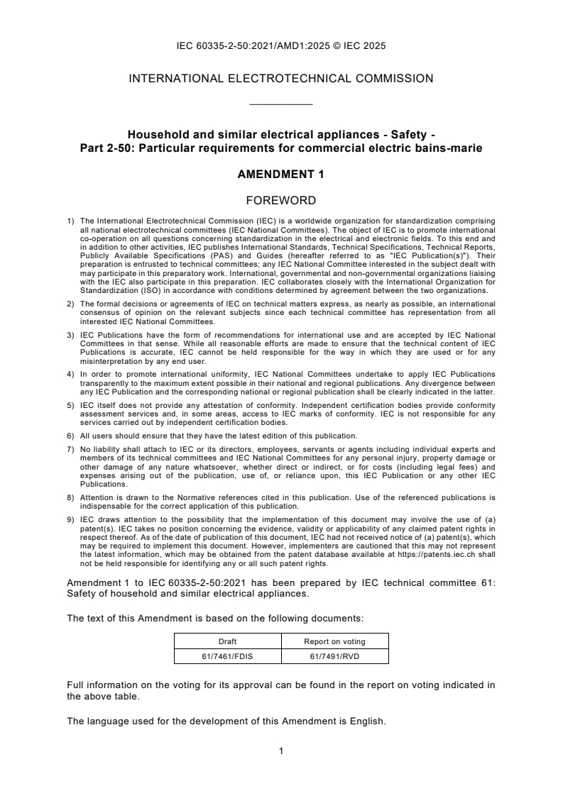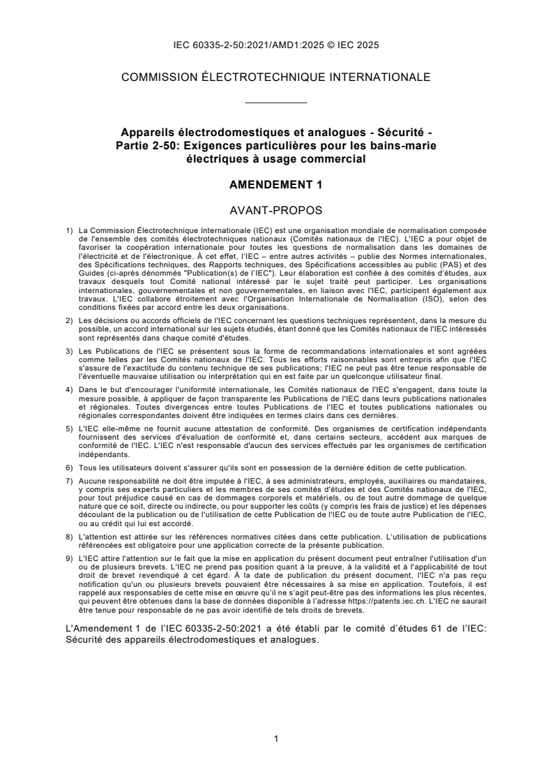 IEC 60335-2-50:2021/AMD1:2025 - Amendment 1 - Household and similar electrical appliances - Safety - Part 2-50: Particular requirements for commercial electric bains-marie Released:29. 08. 2025 Isbn:9782832706879