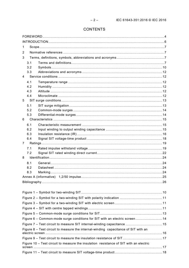 IEC 61643-351:2016 is a standard published by the International Electrotechnical Commission (IEC). Its full title is "Components for low-voltage surge protective devices - Part 351: Performance requirements and test methods for telecommunications and signalling network surge isolation transformers (SIT)". This standard covers: IEC 61643-351:2016 defines test circuits and test methods for determining and verifying the SIT surge parameters. Preferred performance values for key parameters are given. Surge isolation transformers (SITs) are used for signal transformer applications with signal levels up to 400 V peak to peak. SITs are transformers, with or without an internal-winding screen, with a rated impulse withstand voltage greater than the peak voltage of the expected common-mode surge environment. SITs are applicable to components for surge protection against indirect and direct effects of lightning or other transient overvoltage. SITs are used to mitigate the onward propagation of common-mode voltage surges. This part of IEC 61643 does not cover SIT operation under differential-mode lightning surge conditions. Keywords: Surge isolation transformers (SITs)
