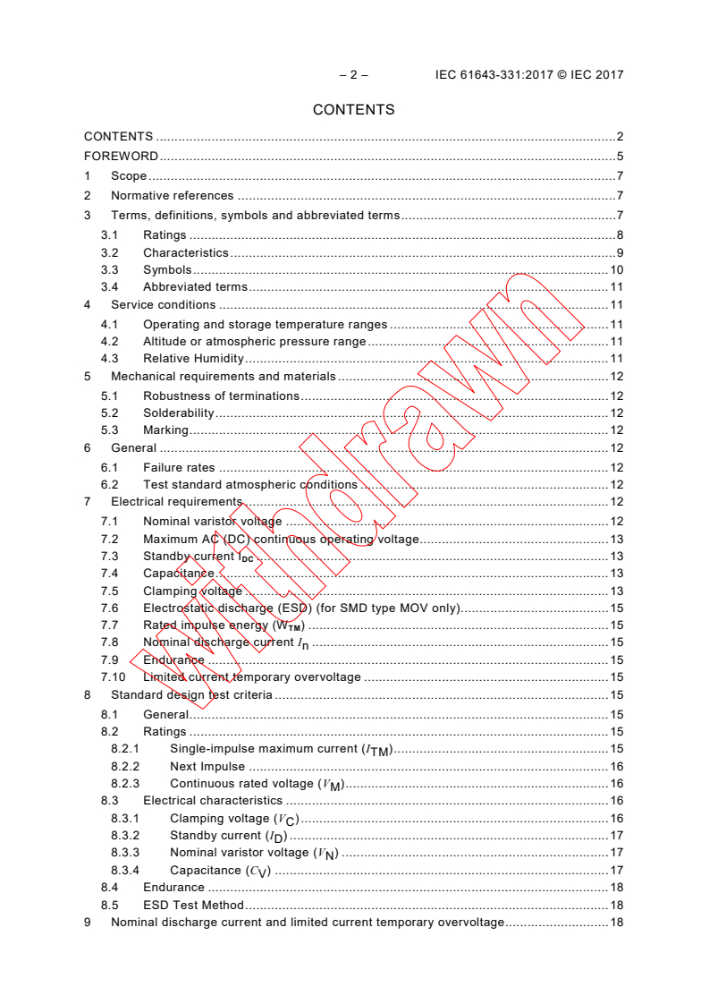 IEC 61643-331:2017 is a standard published by the International Electrotechnical Commission (IEC). Its full title is "Components for low-voltage surge protective devices - Part 331: Performance requirements and test methods for metal oxide varistors (MOV)". This standard covers: IEC 61643-331:2017 is a test specification for metal oxide varistors (MOV), which are used for applications up to 1 000 V AC or 1 500 V DC in power line, or telecommunication, or signalling circuits. They are designed to protect apparatus or personnel, or both, from high transient voltages. This specification applies to MOVs having two electrodes and hybrid overvoltage protection components. This specification also does not apply to mountings and their effect on the MOV’s characteristics. Characteristics given apply solely to the MOV mounted only in the ways described for the tests. This second edition cancels and replaces the first edition published in 2003. This edition constitutes a technical revision. This edition includes the following significant technical changes with respect to the previous edition: a) Update of the nominal varistor voltage test method; b) Addition of thermally protected varistors – component symbol and test methods; c) Addition of nominal discharge current – test methods; d) Addition of voltage ratings for disc types (Table 1); e) Addition of test currents for clamping voltage of disc types (Table 2); f) Addition of typical voltage ratings of SMD types (Table 3); and g) Addition of Limited current and temporary overvoltage tests for thermally protected varistors. Keywords: metal oxide varistors (MOV), high transient voltages.