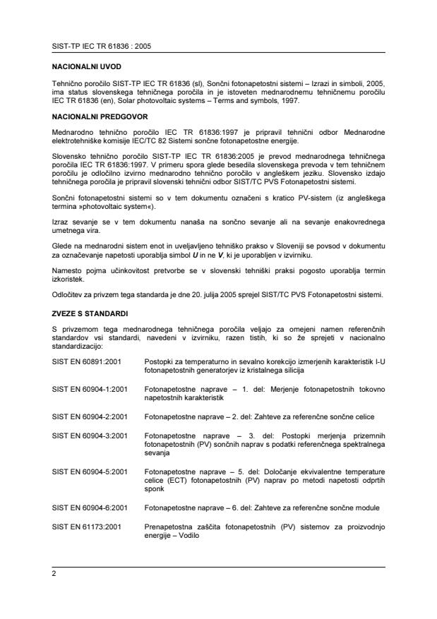 IEC/TS 61836 is a technical report – translation published by the International Electrotechnical Commission (IEC). Its full title is "Solar photovoltaic energy systems - Terms, definitions and symbols". This standard covers: Provides terms, definitions and symbols from national and international solar photovoltaic standards and relevant documents used within the field of solar photovoltaic (PV) energy systems. The main changes with respect to the previous edition are as follows: increased number of terms, inclusion of a list of abbreviations, organization of terms in categories and families.