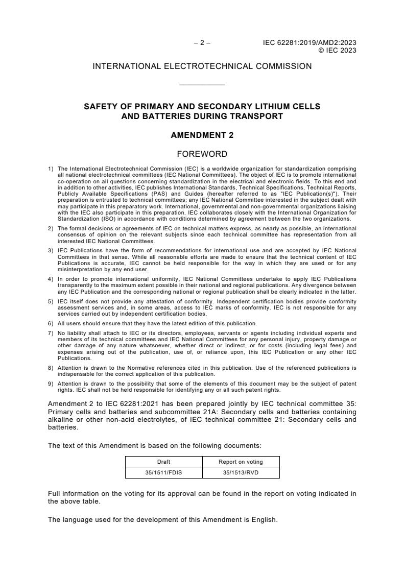 Amendment 2 to IEC 62281:2021 has been prepared jointly by IEC technical committee 35: