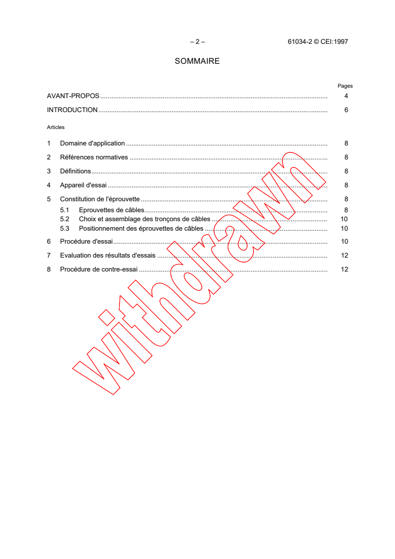 IEC 61034-2:1997 is an international standard published by the International Electrotechnical Commission (IEC) that specifies the test procedure and requirements for measuring smoke density emitted by cables burning under defined conditions. This Part 2 of the IEC 61034 series focuses on describing how to prepare, assemble, and test cable specimens, the method for burning the cables, and criteria for evaluating the results. It is recognized as a group safety publication under IEC Guide 104, reflecting its importance in safety testing of electric cables.