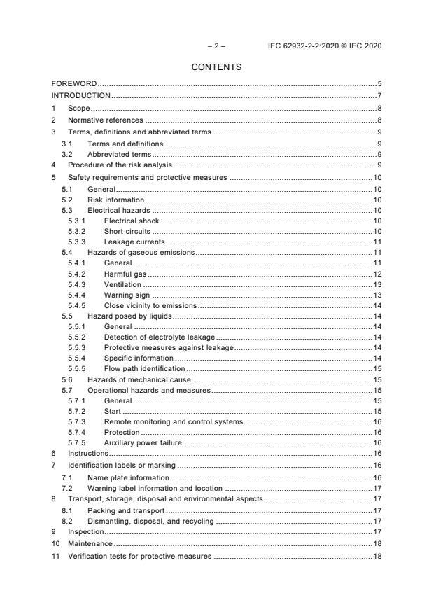 IEC 62932-2-2:2020 is a standard published by the International Electrotechnical Commission (IEC). Its full title is "Flow battery energy systems for stationary applications - Part 2-2: Safety requirements". This standard covers: IEC 62932-2-2:2020 applies to flow battery systems for stationary applications and their installations with a maximum voltage not exceeding 1 500 V DC in compliance with IEC 62932-1. This document defines the requirements and test methods for risk reduction and protection measures against significant hazards relevant to flow battery systems, to persons, property and the environment, or to a combination of them. This document is applicable to stationary flow battery systems intended for indoor and outdoor commercial and industrial use in non-hazardous (unclassified) areas. This document covers significant hazards, hazardous situations and events, with the exception of those associated with natural disaster, relevant to flow battery systems, when they are used as intended and under the conditions foreseen by the manufacturer including reasonably foreseeable misuse thereof. The requirements described in this document are not intended to constrain innovations. When considering fluids, materials, designs or constructions not specifically dealt with in this document, these alternatives are evaluated as to their ability to yield levels of safety equivalent to those specified in this document.