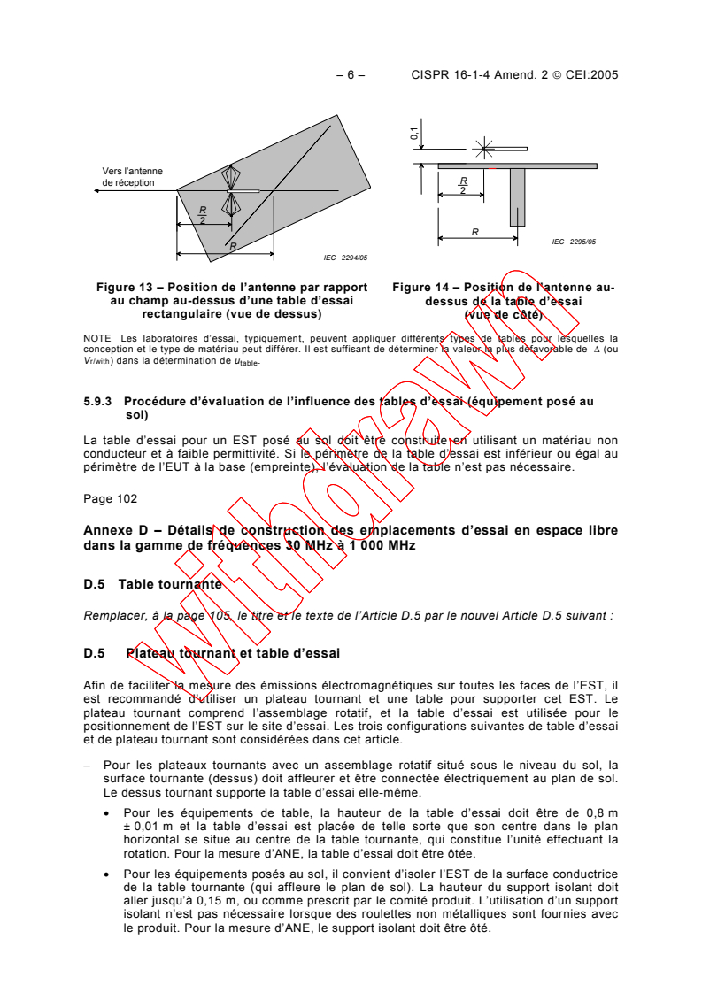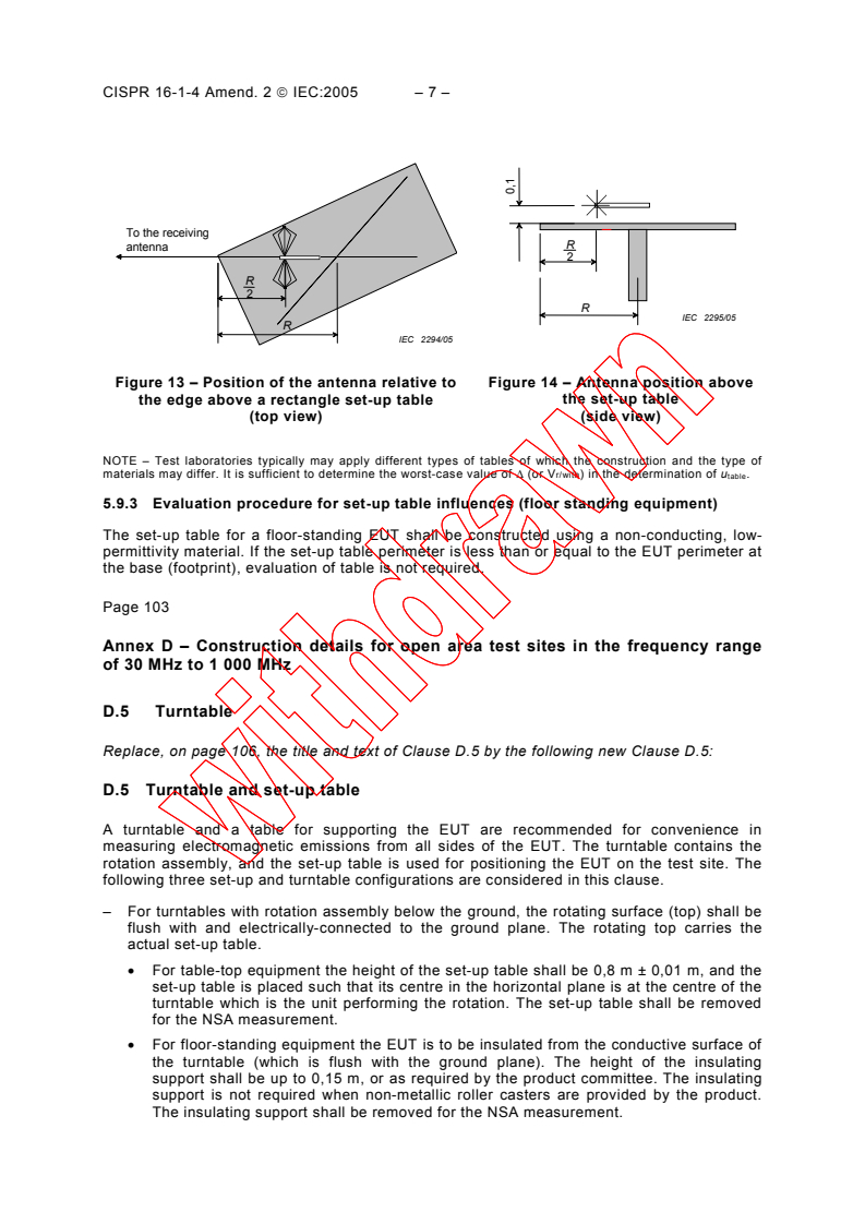 Detailed guidelines are provided for turntable and set-up table arrangements to facilitate full 360-degree radiated emission testing. The amendment addresses both turntables with ground flush rotation assemblies and those integrated into the set-up table.Bibliography and References