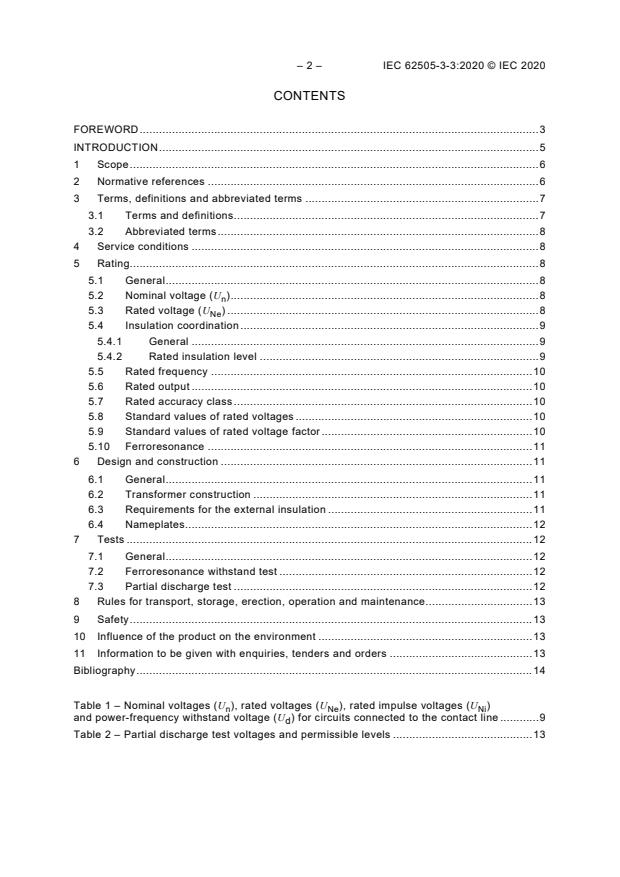 IEC 62505-3-3:2020 is applicable to new voltage transformers which are: - intended for use in indoor or outdoor fixed installations in tractions systems, and - operated with an AC line voltage and frequency as specified in IEC 60850. This document also applies to voltage transformers other than inductive types as far as reasonably possible. Requirements of this document have priority. This second edition cancels and replaces the first edition published in 2009. This edition includes the following significant technical changes with respect to the previous edition: This standard was revised to reflect the latest versions of standards referenced and to remove text already included in the IEC 61869 series. The structure of the document was adapted to that of IEC 62505‑1 and IEC 62505‑2. Ratings have been added to provide designations in line with other railway standards, for example IEC 62497. Tests requirements have been detailed to meet operating conditions of railway applications. Partial discharge voltages have been specified