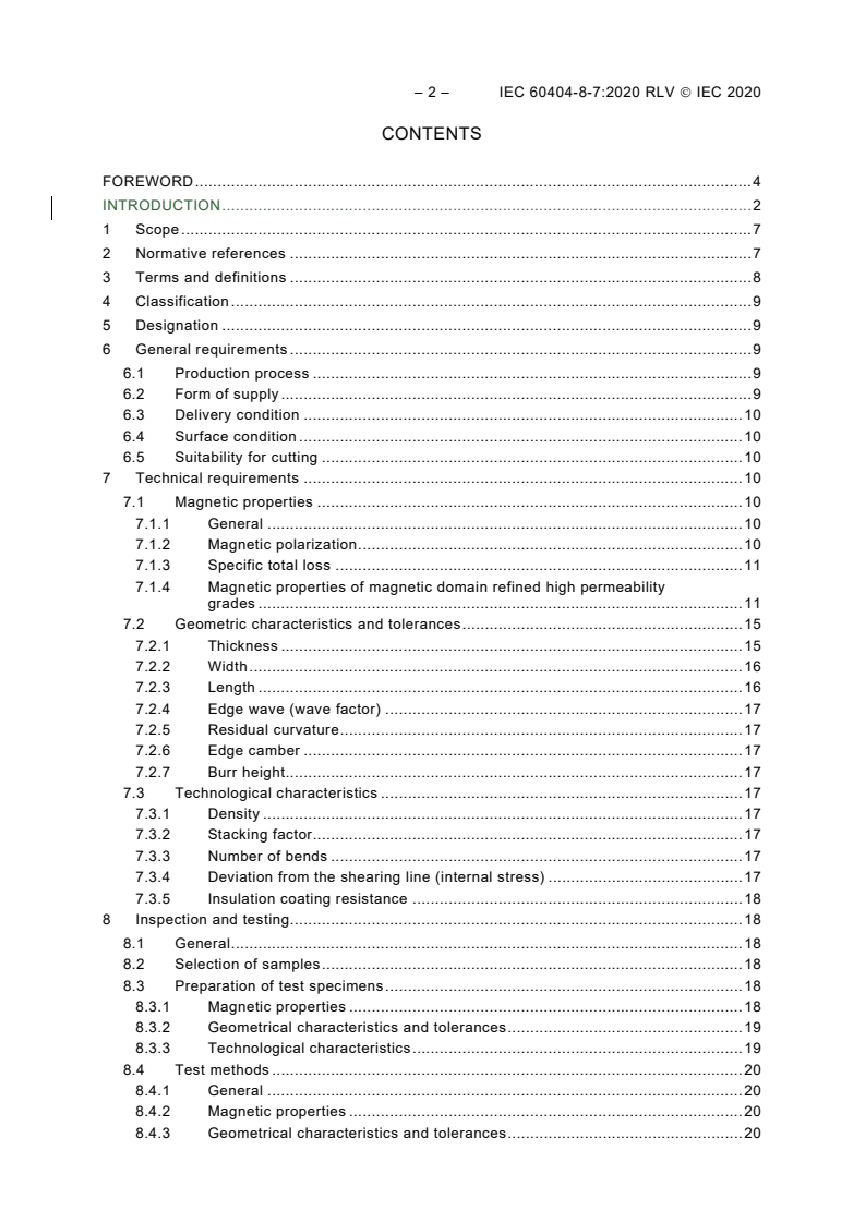 IEC 60404-8-7:2020 defines the grades of cold-rolled grain-oriented electrical steel strip and sheet in nominal thicknesses of 0,20 mm, 0,23 mm, 0,27 mm, 0,30 mm and 0,35 mm. In particular, it gives general requirements, magnetic properties, geometric characteristics, tolerances and technological characteristics, as well as inspection procedures. This document applies to Goss textured grain-oriented electrical steel strip and sheet supplied in the final annealed condition in coils or sheets, and intended for the construction of magnetic circuits. The grades are grouped into three classes:
