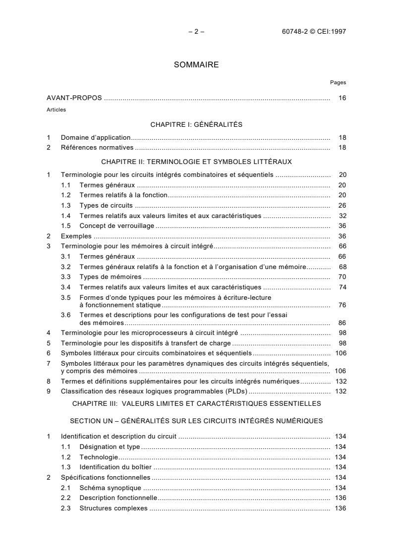 Donne les normes pour les catégories ou sous-catégories suivantes de dispositifs: - Circuits digitaux combinatoires et séquentiels; - Mémoires à circuit intégré; - Microprocesseur à circuit intégré; - Dispositifs de transfert de charge. Doit être utilisée avec les CEI 60747-1 et 60748-1.
