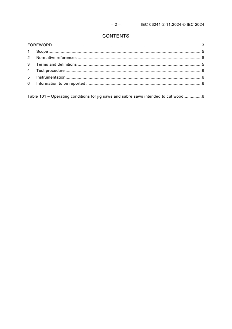 IEC 63241-2-11:2024 is an international standard published by the International Electrotechnical Commission (IEC) that specifies particular requirements for dust measurement procedures on hand-held reciprocating saws, specifically jig saws and sabre saws. This standard supplements and modifies clauses in IEC 63241-1:2023, which provides general requirements for dust measurement in electric motor-operated tools.