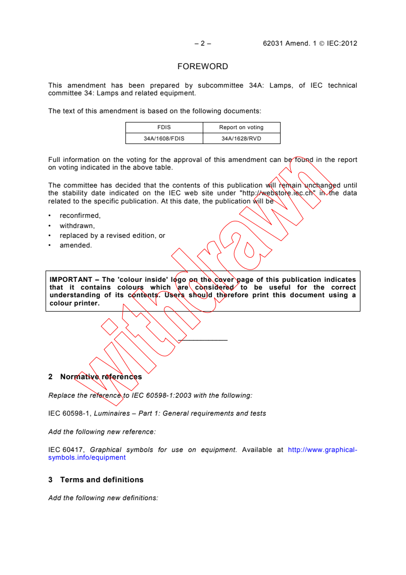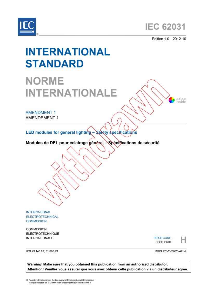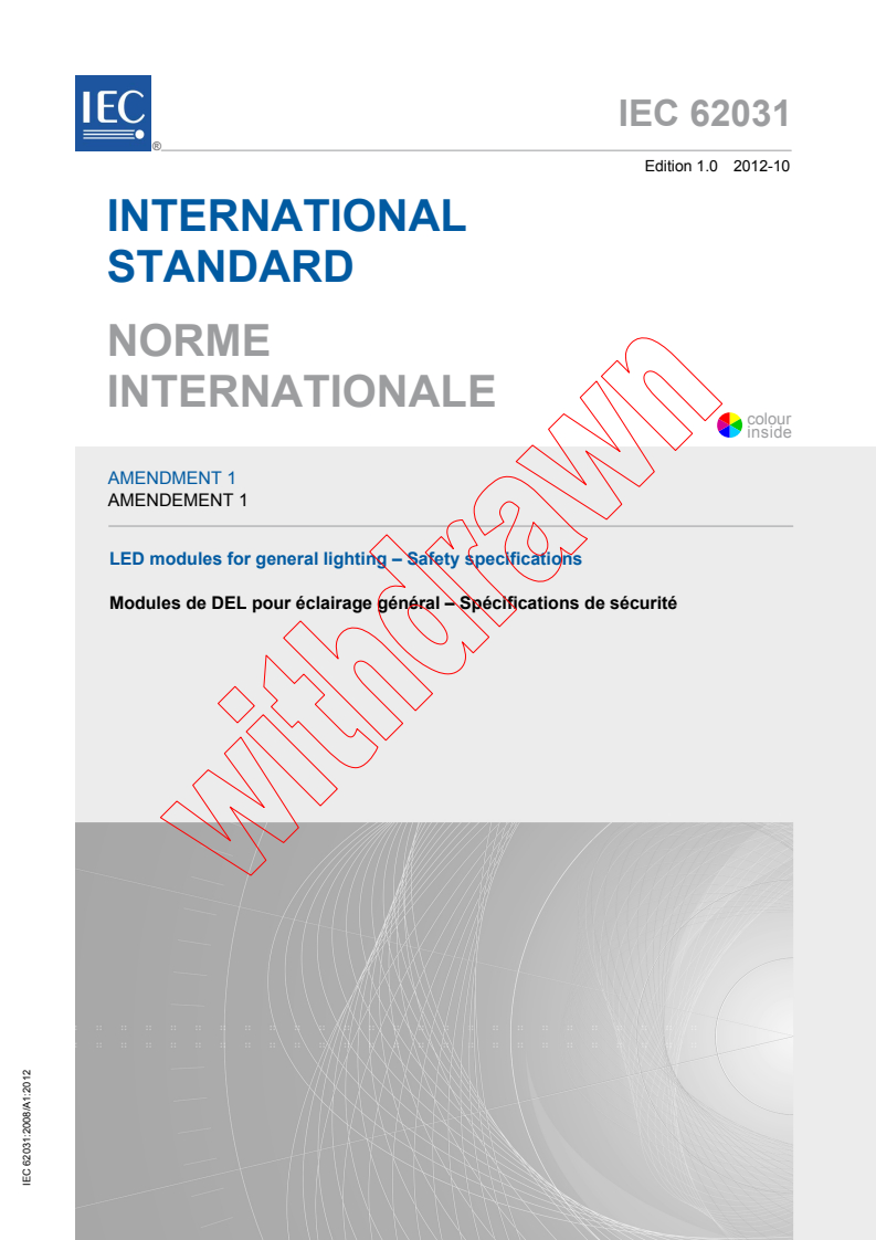 IEC 62031:2008/AMD1:2012 is a standard published by the International Electrotechnical Commission (IEC). Its full title is "Amendment 1 - LED modules for general lighting - Safety specifications". This standard covers: Amendment 1 - LED modules for general lighting - Safety specifications