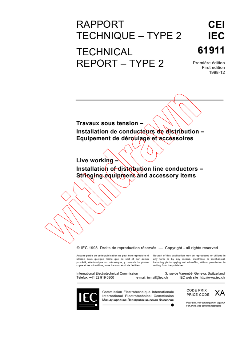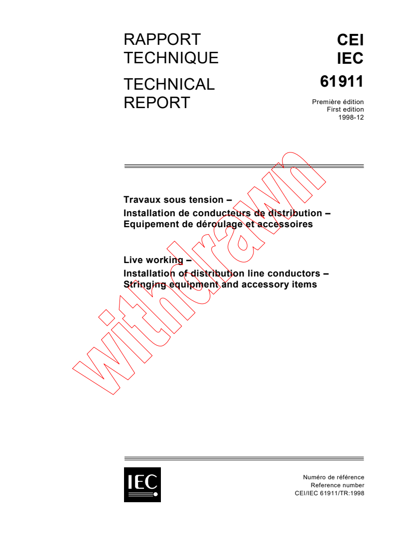 IEC TS 61911:1998 is a technical specification published by the International Electrotechnical Commission (IEC). Its full title is "Live working - Installation of distribution line conductors - Stringing equipment and accessory items". This standard covers: Provides recommendations for the selection and testing where necessary of conductor stinging equipment and accessory items used for the installation of bare and insulated overhead distribution conductors. Procedures are recommended for proper earthing in order to protect equipment, components and personnel from currents which can result from accidental contact with nearby energized conductors, or induced voltage from adjacent energized transmission lines, lightning strikes, switching errors, or electrostatic charging.