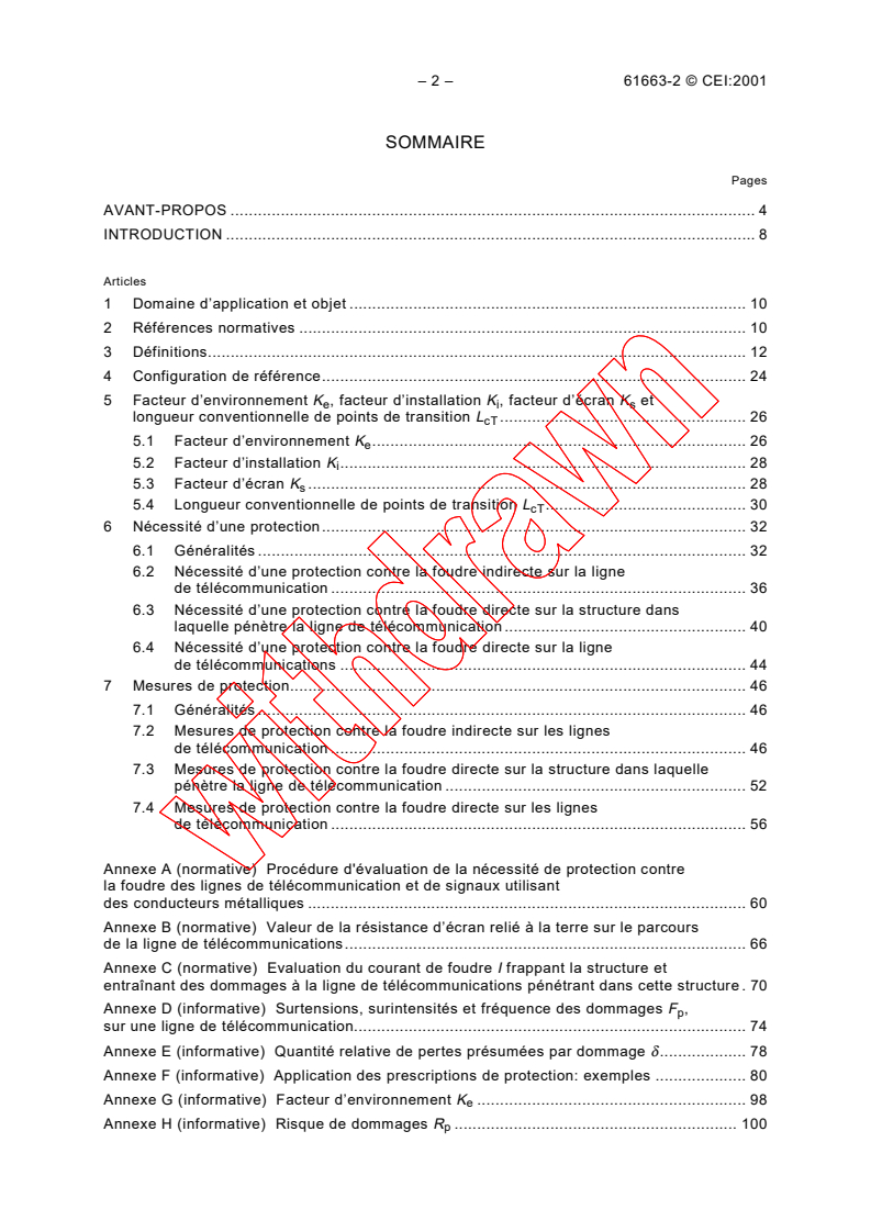 IEC 61663-2:2001 is a standard published by the International Electrotechnical Commission (IEC). Its full title is "Lightning protection - Telecommunication lines - Part 2: Lines using metallic conductors". This standard covers: Deals with protection against lightning of outdoor telecommunication lines using metallic conductors (for example, access networks, lines between buildings). These lines concern: - telecommunication lines connecting a switch with a network termination (NT1) - telecommunication or signal lines connecting equipment located in different buildings, e.g. ISDN lines or signal lines between computers. The object of this standard is to protect telecommunication lines and connected equipment against the direct and indirect influence of lightning by limiting the risk of damage due to overvoltages and overcurrents, liable to occur in these lines, to values which are lower than or equal to tolerable risk of damage. The type of building can also have an effect on the risk assessment of lightning damage to telecommunication lines, as well as the physical layout of the equipment installation. However, these and other similar aspects are covered by appropriate, specific standards and are beyond the scope of this standard. Fibre optical cable with metallic pairs in the cable core must be protected, following the requirements of this standard, together with those requirements defined in IEC 61663-1.