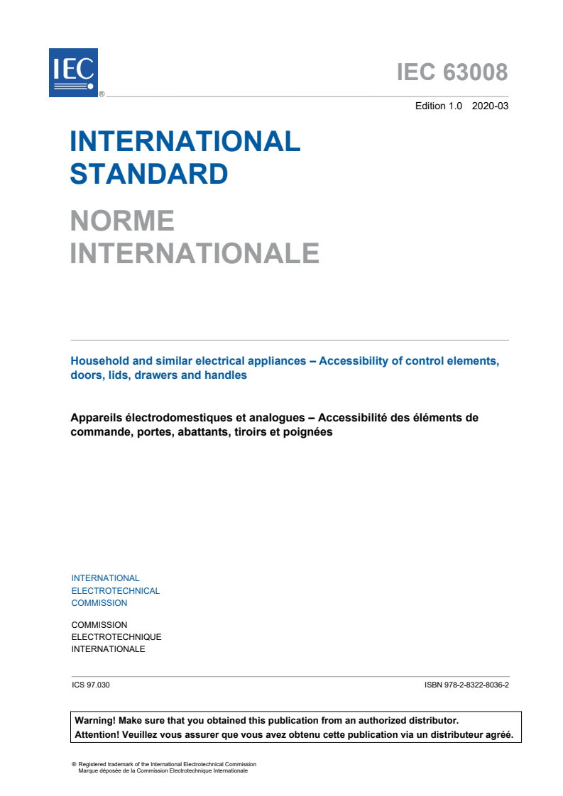IEC 63008:2020 is an international standard published by the International Electrotechnical Commission (IEC) that focuses on the accessibility of household and similar electrical appliances. This standard establishes essential requirements to improve the usability of control elements, doors, lids, drawers, and handles for older adults and people with disabilities. By providing practical guidance and test methods, IEC 63008:2020 supports designers and manufacturers in creating more inclusive products that address accessibility needs without compromising safety.