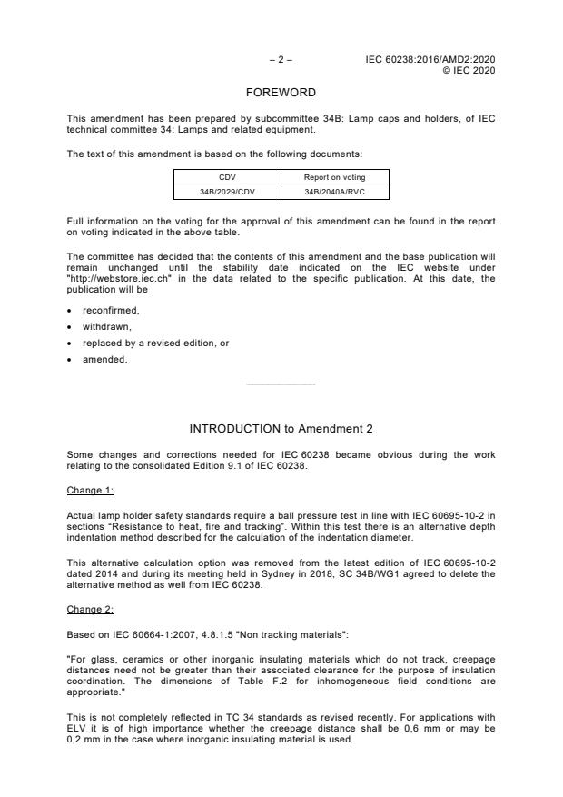 IEC 60238:2016/AMD2:2020 is a standard published by the International Electrotechnical Commission (IEC). Its full title is "Amendment 2 - Edison screw lampholders". This standard covers: Amendment 2 - Edison screw lampholders
