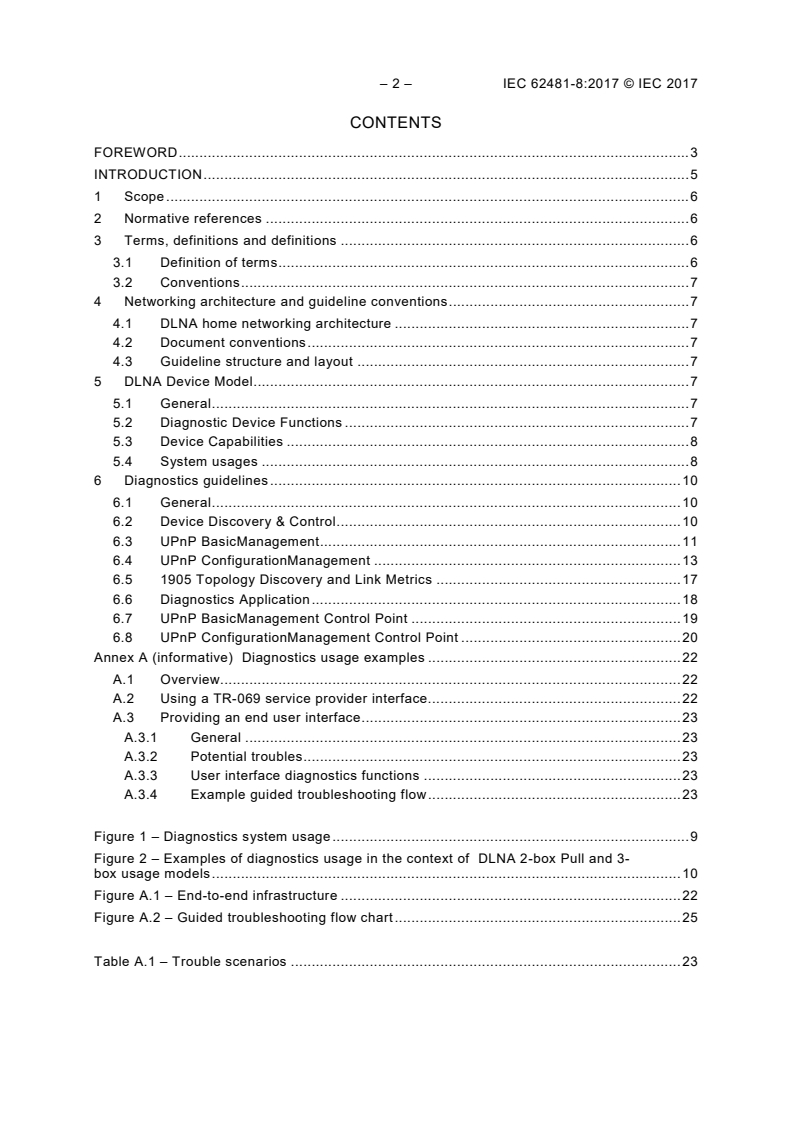 IEC 62481-8:2017 - "Digital Living Network Alliance (DLNA) home networked device interoperability guidelines - Part 8: Diagnostics" defines DLNA-guided diagnostics for consumer home networks. The standard focuses on the collection of diagnostic data via test actions and queries (UPnP actions, 1905 primitives, etc.), and on how devices should expose that information to management interfaces. Note: actual troubleshooting procedures and remedies are explicitly outside the scope - the document standardizes how to obtain diagnostics data, not how to fix problems.