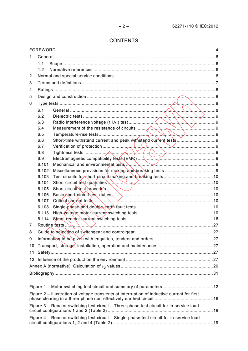 IEC 62271-110:2012 is a standard published by the International Electrotechnical Commission (IEC). Its full title is "High-voltage switchgear and controlgear - Part 110: Inductive load switching". This standard covers: IEC 62271-110:2012 is applicable to a.c. circuit-breakers designed for indoor or outdoor installation, for operation at frequencies of 50 Hz and 60 Hz on systems having voltages above 1 000 V and applied for inductive current switching with or without additional short-circuit current breaking duties. The standard is applicable to circuit-breakers in accordance with IEC 62271-100 that are used to switch high-voltage motor currents and shunt reactor currents and also to high-voltage contactors used to switch high-voltage motor currents as covered by IEC 62271-106. For circuit-breakers applied to switch shunt reactor currents at rated voltages according to IEC 62271-1:2007 Tables 2a and 2b, combined voltage tests across the isolating distance are not required (refer to 4.2). This third edition cancels and replaces the second edition published in 2009 and constitutes a technical revision. This edition includes the following significant technical changes with respect to the previous edition: - former Table 2 has been split into three new tables to conform with IEC 62271-100 and to address actual in service circuit configurations. - the criteria for successful testing has been revised to a more explicit statement (see 6.114.11a). - comments received in response to 17A/959/CDV and 17A/981/RVC have been addressed. The contents of the corrigendum of October 2012 have been included in this copy. This publication is to be read in conjunction with IEC 62271-1:2007.
