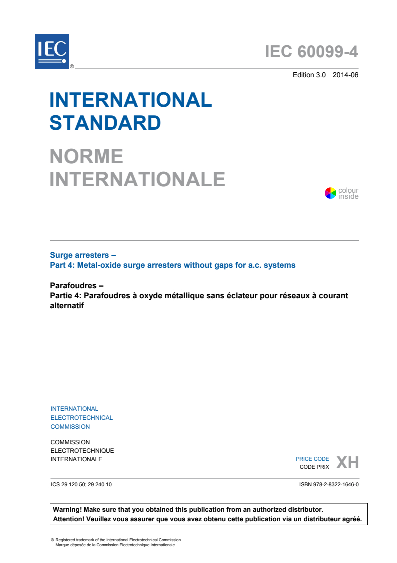 Keywords: IEC 60099-4:2014, metal-oxide surge arresters, gapless surge arresters, a.c. power systems, voltage surges protection, surge arrester testing, transient overvoltage, electrical power protection, IEC standards, surge arrester classification, insulation withstand tests