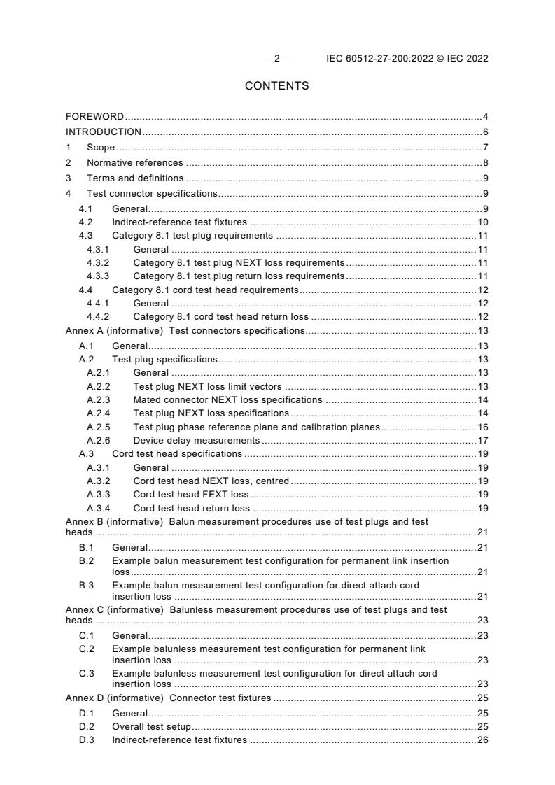 The standard concentrates on signal integrity tests including near-end crosstalk (NEXT), return loss, insertion loss, and similar measures up to 2 GHz on various IEC 60603-7 connector types (e.g., IEC 60603-7-2, -3, -4, -5, -41, -51, -81).Test Connector Specifications