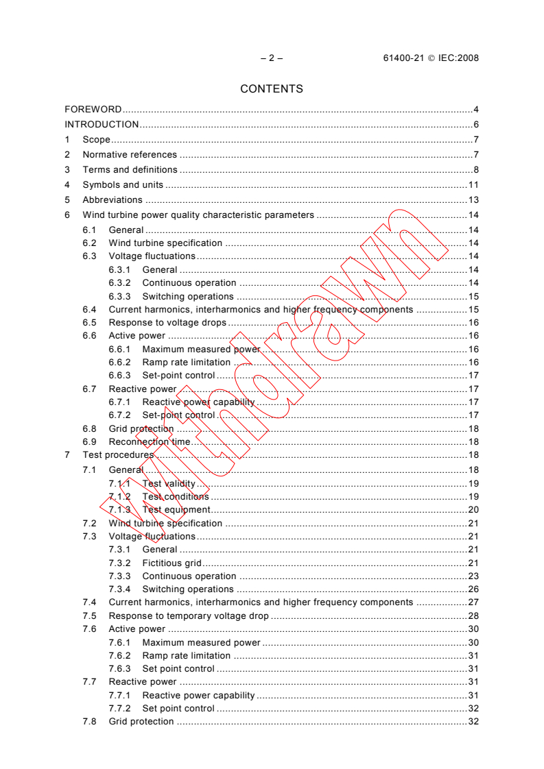 IEC 61400-21:2008 covers the definition and specification of the quantities to be determined for characterizing the power quality of a grid connected wind turbine; measurement procedures for quantifying the characteristics; and procedures for assessing compliance with power quality requirements, including estimation of the power quality expected from the wind turbine type. The main changes with respect to the previous edition deal with interharmonics and current distortions (