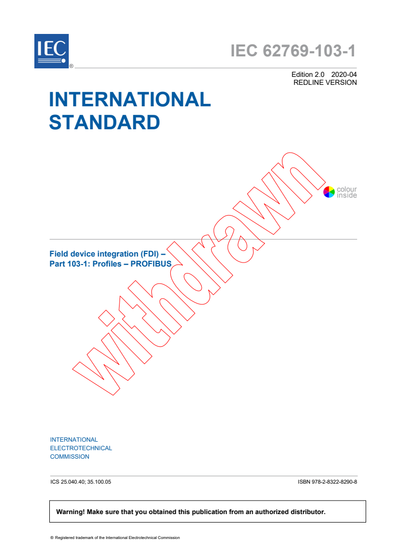 IEC 62769-103-1:2020 is the International Electrotechnical Commission (IEC) profile specification for Field Device Integration (FDI) targeted at PROFIBUS networks. It defines an FDI profile that maps IEC 61784 communication profiles CP 3/1 (PROFIBUS DP) and CP 3/2 (PROFIBUS PA) into the FDI framework. This second edition (2020) replaces the 2015 edition and introduces technical revisions to accelerate technology adoption and streamline device package development.
