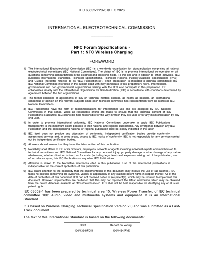 IEC 63652-1:2026 specifies a method and procedures for Wireless Power Transfer between two NFC wireless devices. The provided technical foundations use NFC technology for the initiation, control and execution of 13.56 MHz power transfer.