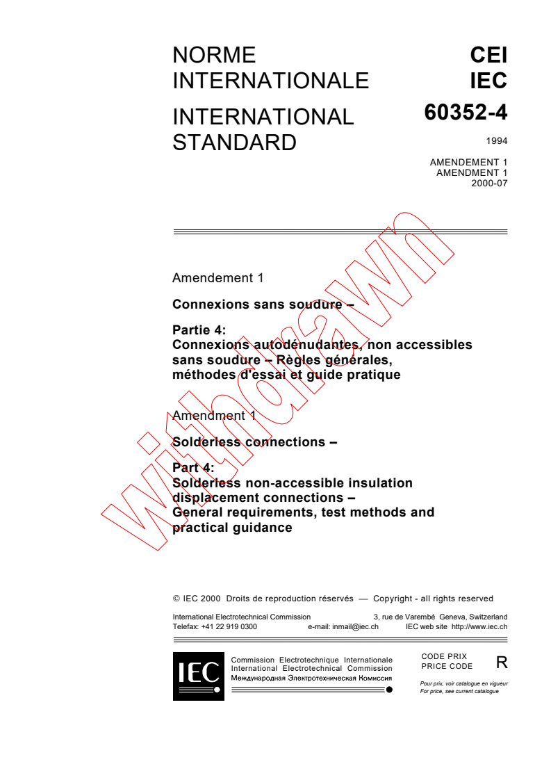 IEC 60352-4:1994/AMD1:2000 is a standard published by the International Electrotechnical Commission (IEC). Its full title is "Amendment 1 - Solderless connections - Part 4: Solderless non-accessible insulation displacement connections - General requirements, test methods and practical guidance". This standard covers: Amendment 1 - Solderless connections - Part 4: Solderless non-accessible insulation displacement connections - General requirements, test methods and practical guidance