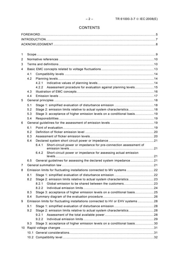 This part of IEC 61000 provides guidance on principles which can be used as the basis for determining the requirements for the connection of fluctuating installations to MV, HV and EHV public power systems (LV installations are covered in other IEC documents). For the purposes of this report, a fluctuating installation means an installation (which may be a load or a generator) that produces voltage flicker and / or rapid voltage changes. The primary objective is to provide guidance to system operators or owners on engineering practices which will facilitate the provision of adequate service quality for all connected customers. In addressing installations, this document is not intended to replace equipment standards for emission limits. This report addresses the allocation of the capacity of the system to absorb disturbances. It does not address how to mitigate disturbances, nor does it address how the capacity of the system can be increased. Since the guidelines outlined in this report are necessarily based on certain simplifying assumptions, there is no guarantee that this approach will always provide the optimum solution for all flicker situations. The recommended approach should be used with flexibility and engineering judgment as far as engineering is concerned, when applying the given assessment procedures in full or in part. The system operator or owner is responsible for specifying requirements for the connection of fluctuating installations to the system. The fluctuating installation is to be understood as the customer's complete installation (i.e. including fluctuating and non fluctuating parts). Problems related to voltage fluctuations fall into two basic categories: - Flicker effect from light sources as a result of voltage fluctuations; - Rapid voltage changes even within the normal operational voltage tolerances are considered as a disturbing phenomenon. The report gives guidance for the coordination of the flicker emissions between different voltage levels in order to meet the compatibility levels at the point of utilisation. This report primarily focuses on controlling or limiting flicker, but a clause is included to address the limitation of rapid voltage changes. This second edition cancels and replaces the first edition published in 1996 and constitutes a technical revision. This new edition is significantly more streamlined than the original technical report (Edition 1), and reflects the experiences gained in the application of the first edition. This technical report has also been harmonised with IEC/TR 61000-3-6 and IEC/TR 61000-3-13. This Technical Report has the status of a basic EMC publication in accordance with IEC Guide 107.