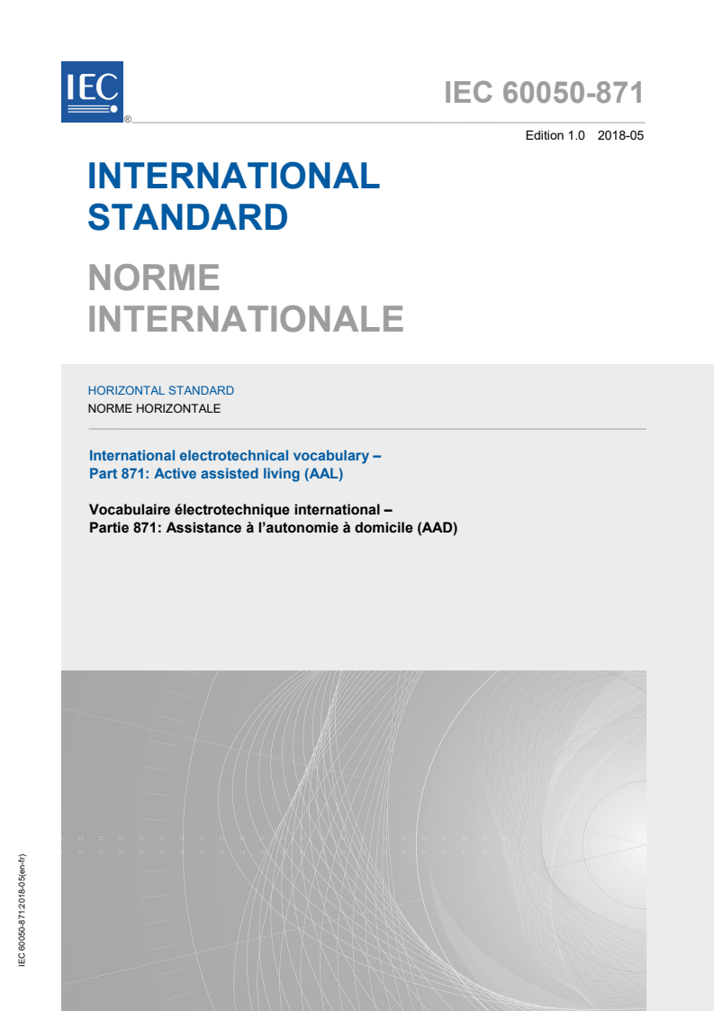IEC 60050-871:2018 is a standard published by the International Electrotechnical Commission (IEC). Its full title is "International Electrotechnical Vocabulary (IEV) - Part 871: Active assisted living (AAL)". This standard covers: IEC 60050-871:2018 gives the general terminology used in active assisted living, as well as general terms pertaining to specific applications and associated technologies. This terminology is consistent with the terminology developed in the other specialized parts of the IEV. It has the status of a horizontal standard in accordance with IEC Guide 108.