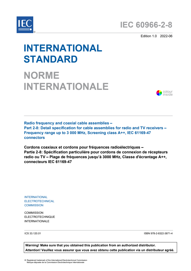 IEC 60966-2-8:2022 - Radio frequency and coaxial cable assemblies - Part 2-8: Detail specification for cable assemblies for radio and TV receivers - Frequency range up to 3000 MHz, Screening class A++, IEC 61169-47 connectors Released:6/17/2022