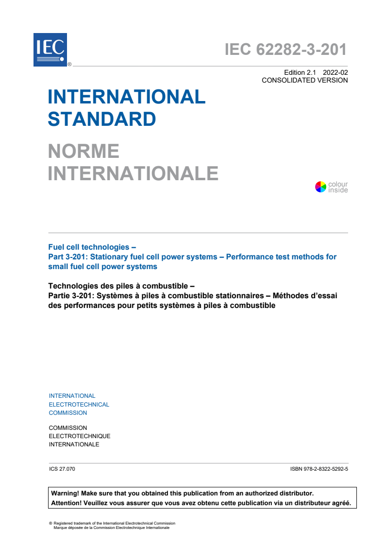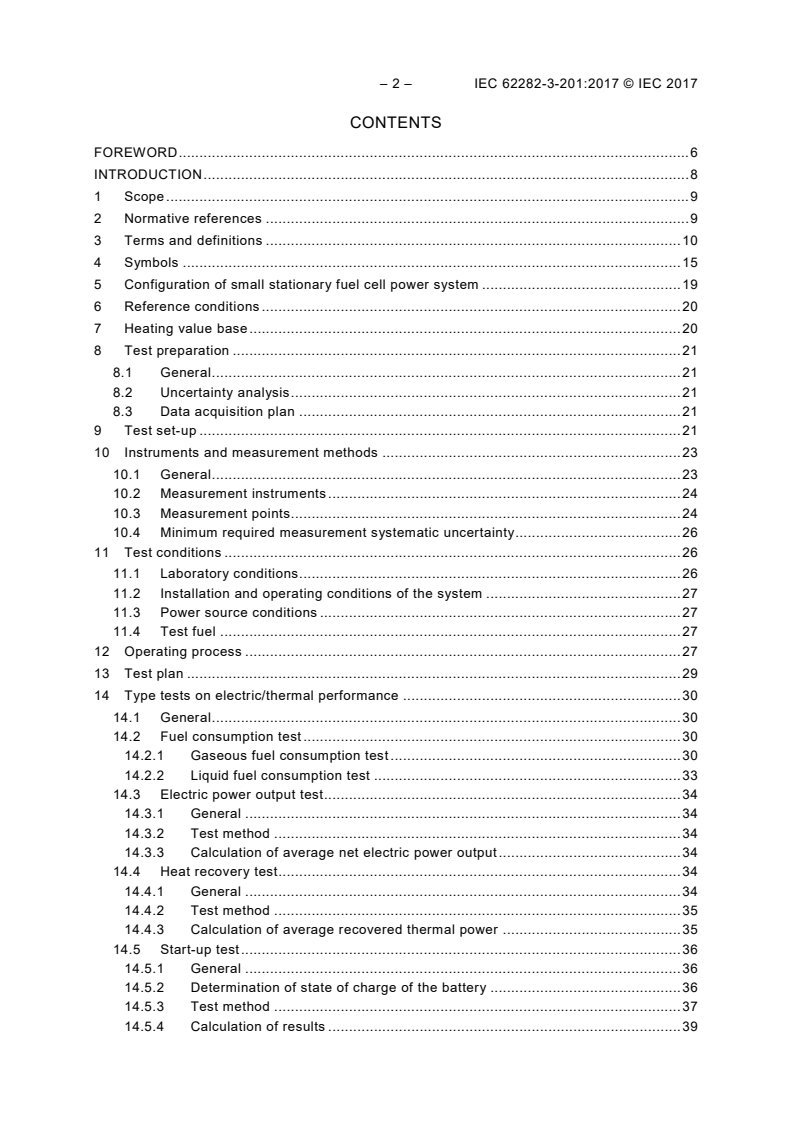IEC 62282-3-201:2017, titled Fuel cell technologies - Part 3-201: Stationary fuel cell power systems - Performance test methods for small fuel cell power systems, is an international standard developed by the International Electrotechnical Commission (IEC). This standard provides comprehensive test methods specifically designed for evaluating the electrical, thermal, and environmental performance of small stationary fuel cell power systems.