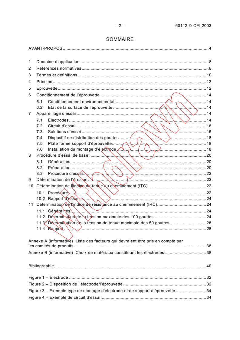IEC 60112:2003 Spécifie la méthode d'essai pour déterminer les indices de résistance et de tenue au cheminement des matériaux isolants solides sur des échantillons prélevés sur des parties d'équipement et des plaques de matériau en utilisant des tensions alternatives. Cette norme détermine la valeur de l'érosion quand cela est demandé. Les résultats d'essai ne peuvent pas être utilisés directement tels quels pour évaluer les lignes de fuite de sécurité lors de la conception des appareils électriques. Les modifications majeures par rapport à l'édition précédente sont celles qui suivent: Le choix d'un matériau pour une application spécifique implique fréquemment des compromis au niveau des propriétés individuelles et des critères d'essai. Dans la précédente édition de la CEI 60112, les critères d'essai requéraient «aucun brûlage de l'éprouvette» mais cela a induit deux problèmes: