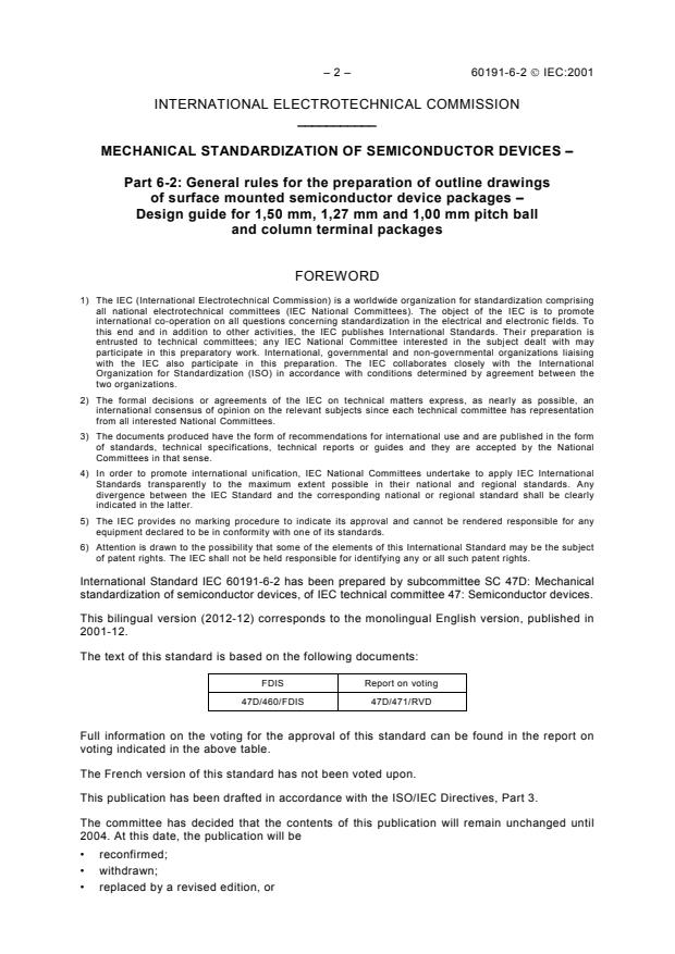 IEC 60191-6-2:2001 - Mechanical standardization of semiconductor devices - Part 6-2: General rules for the preparation of outline drawings of surface mounted semiconductor devices packages - Design guide for 1,50 mm, 1,27 mm and 1,00 mm pitch ball and column terminal packages