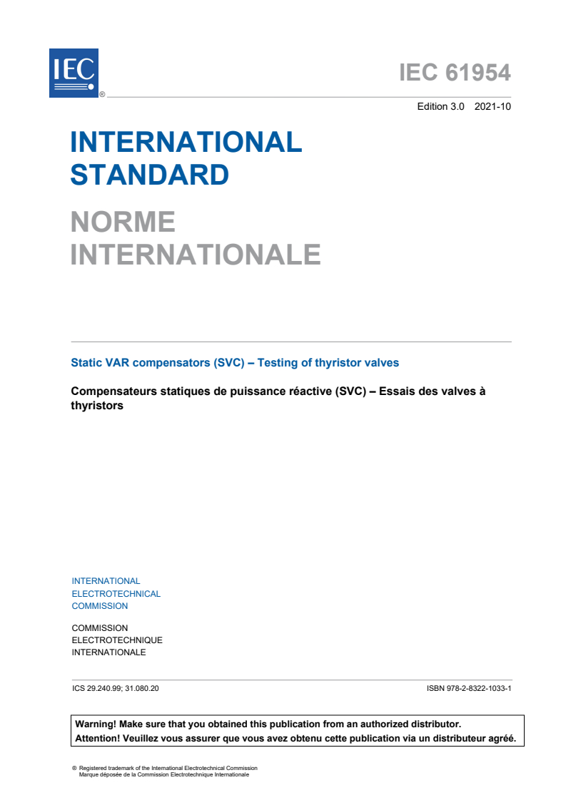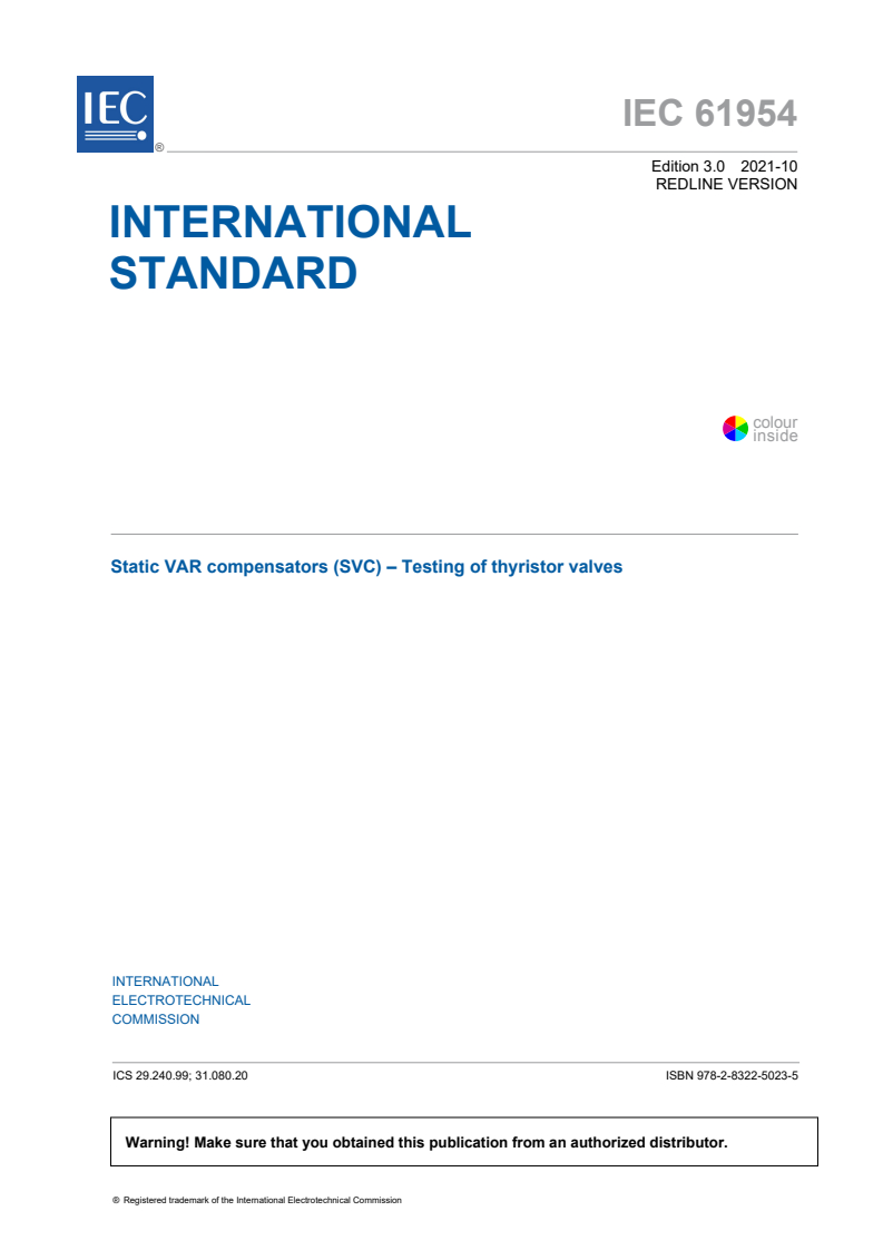 IEC 61954:2021 is a standard published by the International Electrotechnical Commission (IEC). Its full title is "Static VAR compensators (SVC) - Testing of thyristor valves". This standard covers: IEC 61954:2021 defines type, production and optional tests on thyristor valves used in thyristor controlled reactors (TCR), thyristor switched reactors (TSR) and thyristor switched capacitors (TSC) forming part of static VAR compensators (SVC) for power system applications. The requirements of the document apply both to single valve units (one phase) and to multiple valve units (several phases). Clauses 4 to 7 detail the type tests, i.e. tests which are carried out to verify that the valve design meets the requirements specified. Clause 8 covers the production tests, i.e. tests which are carried out to verify proper manufacturing. Clauses 9 and 10 detail optional tests, i.e. tests additional to the type and production tests. This edition includes the following significant technical changes with respect to the previous edition: important clarifications were made in 4.4.1.2, 5.1.2.2, 5.1.3.2, 5.2.3.2, 6.1.2.2, 6.1.2.4, 6.1.3.2, 6.2.2.2, 6.2.2.4, 6.3.2.2 and 9.3.2. The contents of the corrigendum of June 2024 have been included in this copy.