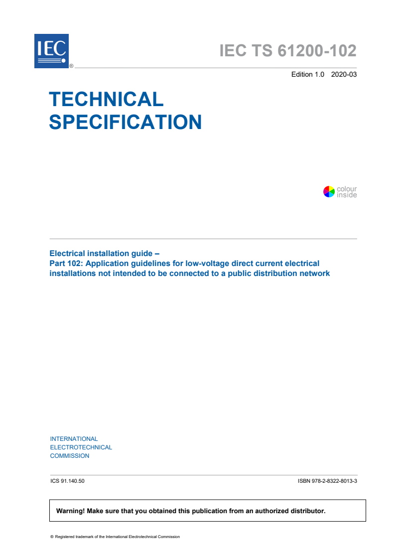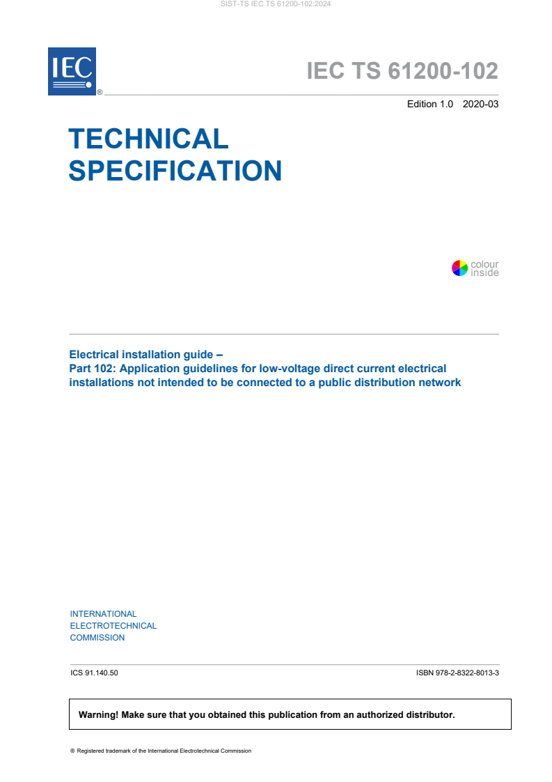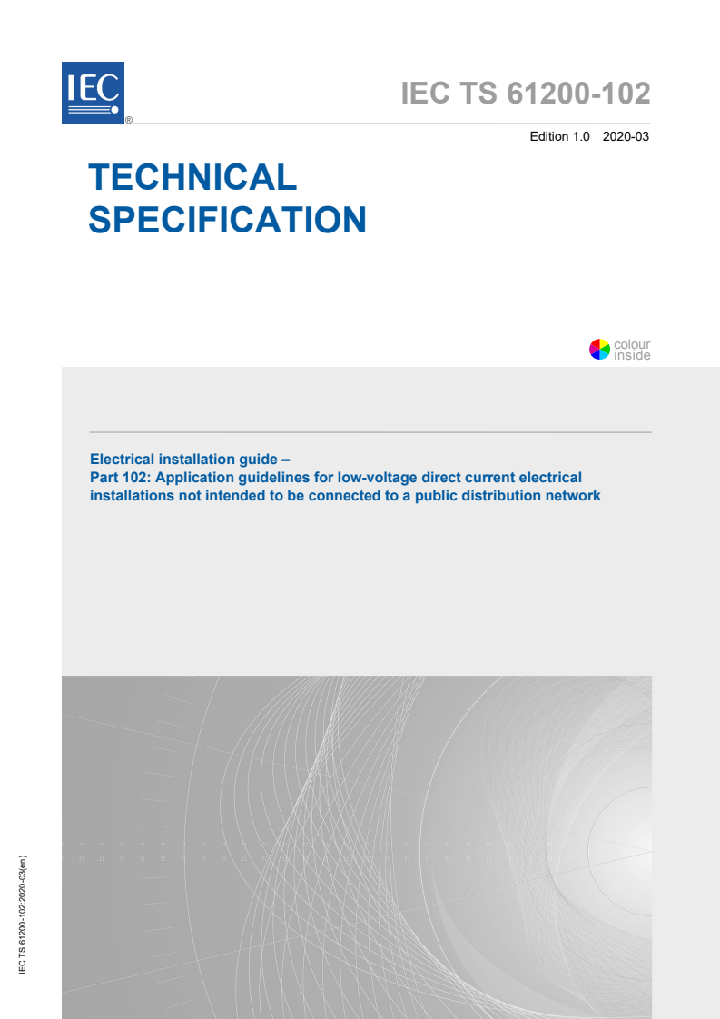 IEC TS 61200-102:2020 - Electrical installation guide - Part 102: Application guidelines for low-voltage direct current electrical installations not intended to be connected to a public distribution network Released:3/27/2020