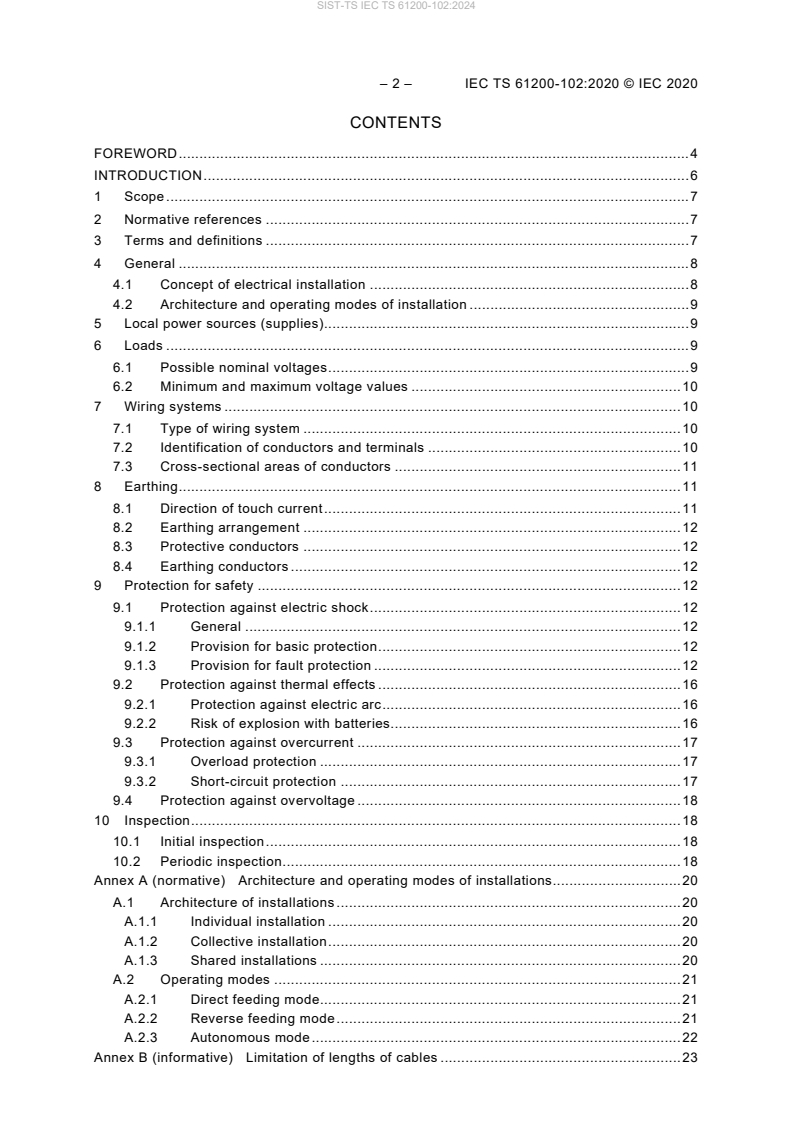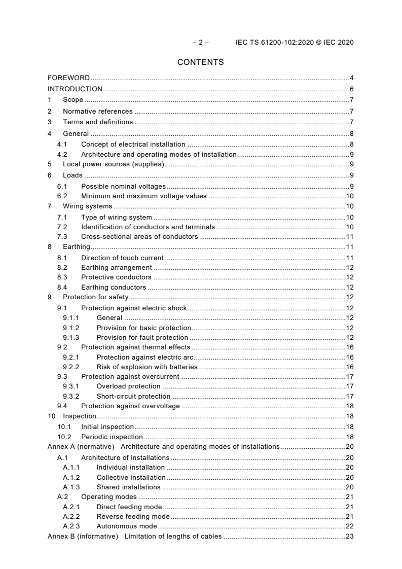 IEC TS 61200-102:2020(E) applies to low-voltage DC electrical installations entirely supplied by local power sources and having a nominal voltage lower or equal to the low-voltage limit. These installations can be connected to collective or shared private electrical installations.