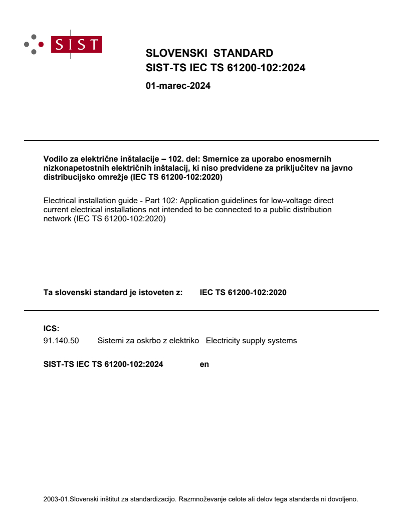 IEC TS 61200-102:2020 is a technical specification published by the International Electrotechnical Commission (IEC). Its full title is "Electrical installation guide - Part 102: Application guidelines for low-voltage direct current electrical installations not intended to be connected to a public distribution network". This standard covers: IEC TS 61200-102:2020(E) applies to low-voltage DC electrical installations entirely supplied by local power sources and having a nominal voltage lower or equal to the low-voltage limit. These installations can be connected to collective or shared private electrical installations. This document also applies to DC installations according to use cases TIER 2 and TIER 3 of the World Bank defined in ESMAP 008/15 report: Beyond Connections Energy Access Redefined